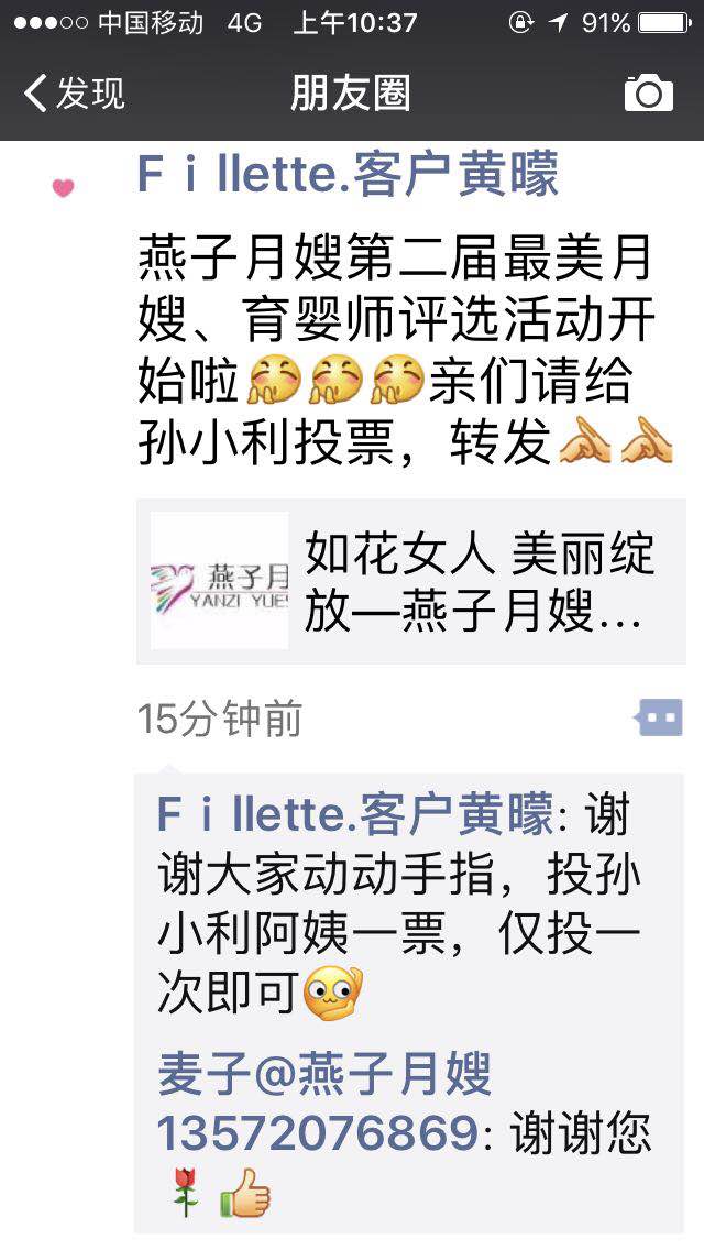 好多燕子客戶在微信公眾平臺(tái)里面留言希望能每天給自己的月嫂投票,非常感謝您的信任和支持,投票的方式不能改動(dòng)了(每個(gè)微信號(hào)只能投一票),希望您能理解。小編悄悄說:可以將下面的鏈接轉(zhuǎn)發(fā)到自己的朋友圈,為喜歡的月嫂育嬰師拉拉票!