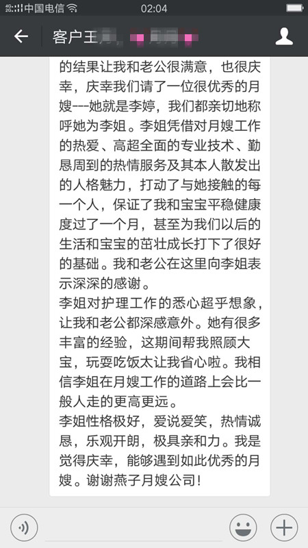 每次的感謝都來自于客戶的認可和信賴,燕子月嫂阿姨們用自己的愛和付出,得到了客戶的肯定。李婷姐姐在客戶家一心護理寶寶和產婦,獲得了客戶的高度評價,為李姐感到驕傲。燕子月嫂會繼續努力培養出更多的優秀月嫂,為新爸爸媽媽保駕護航,幫助新媽媽做一個舒適安心的好月子,幫助寶寶度過人生中最重要的第一個月!