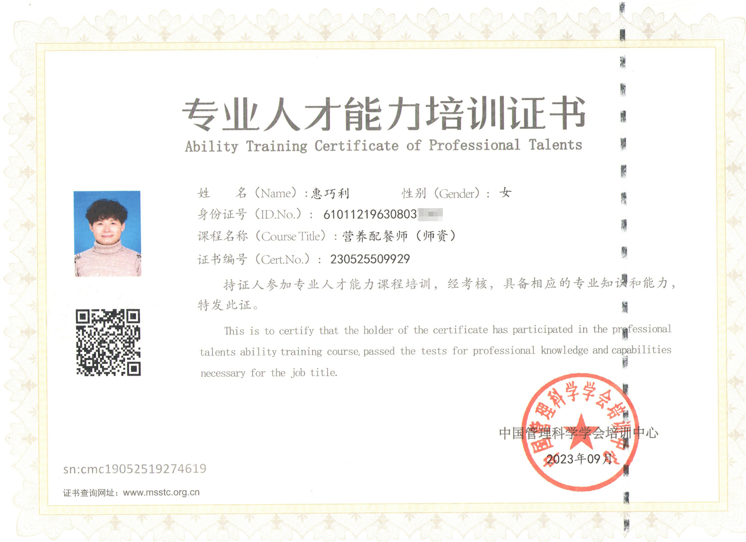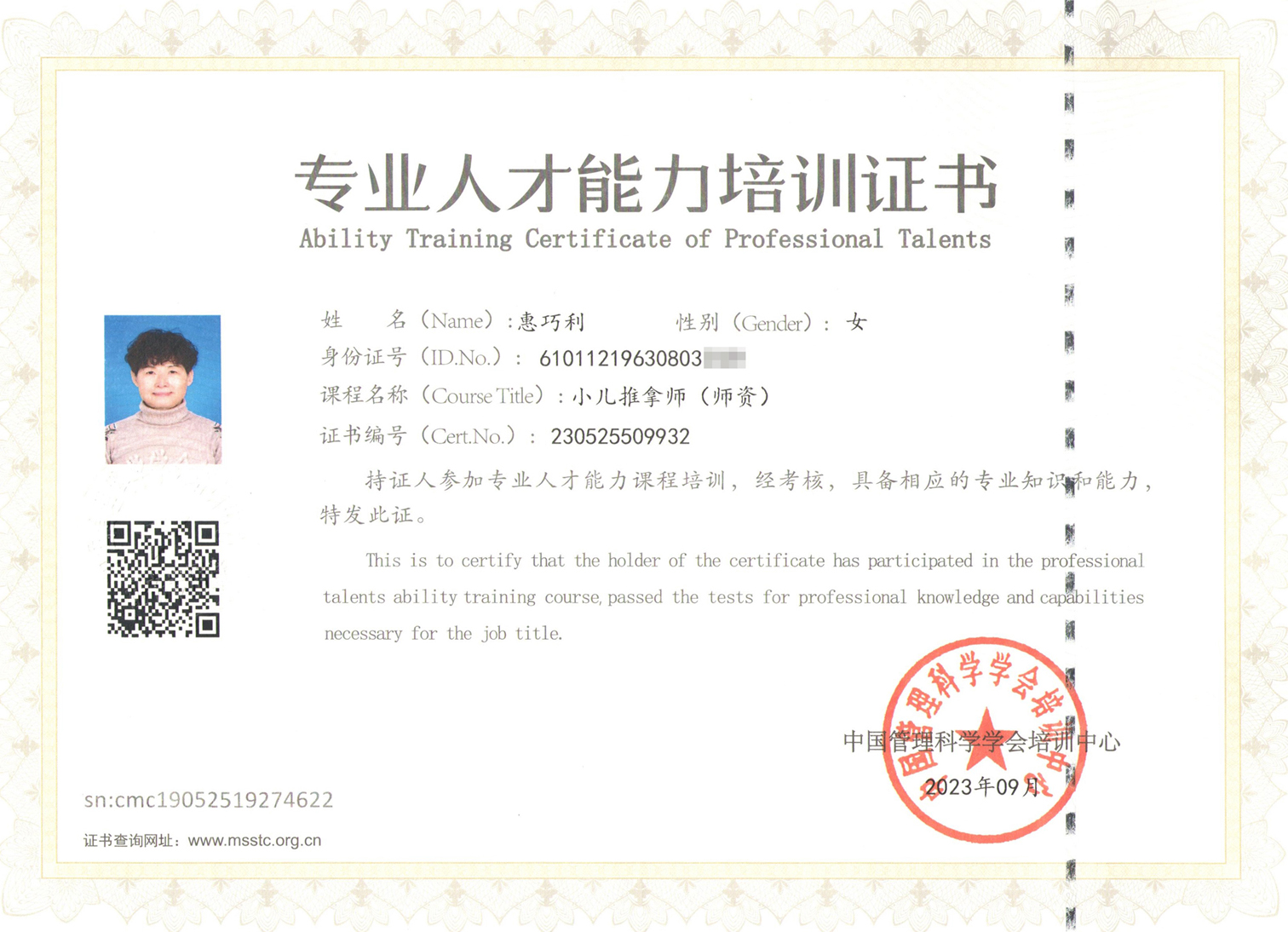 工商管理大專畢業,2008年開始在公司從事月嫂技術指導工作。工作期間學習了中醫營養學及專業母嬰護理等知識,2012年遠赴北京參加高級催乳師師資學習,取得師資證。2013年先后參加產后技能培訓、蒙氏早教培訓、高級母嬰護理師師資培訓并取得相關證書,現任我公司特色課程高級講師。國際泌乳師協會會員、資深催乳師講師、陜西省總工會、渭南就業局、延安職業技術學院、榆林總工會等政府機構的特聘講師。