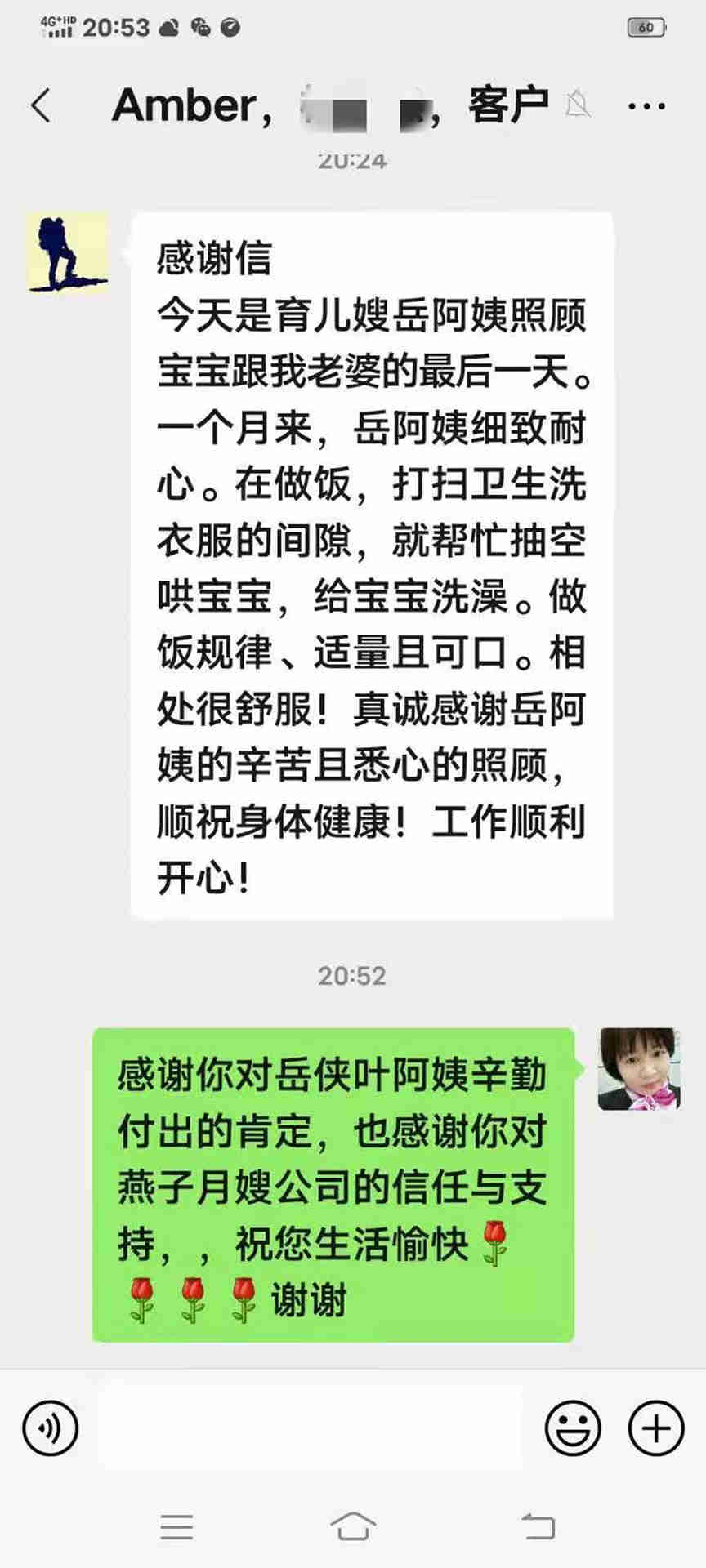 今天是育兒嫂岳阿姨照顧寶寶跟我老婆的最后一天。一個月來,岳阿姨細致耐心。在做飯,打掃衛生洗衣服的間隙,就幫助抽空哄寶寶,給寶寶洗澡。做飯規律、適量且可口。相處很舒服!真誠感謝岳阿姨的辛苦且悉心的照顧,順祝身體健康!工作順利開心!