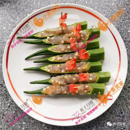 將攪拌好的肉餡均勻的鋪在秋葵上。