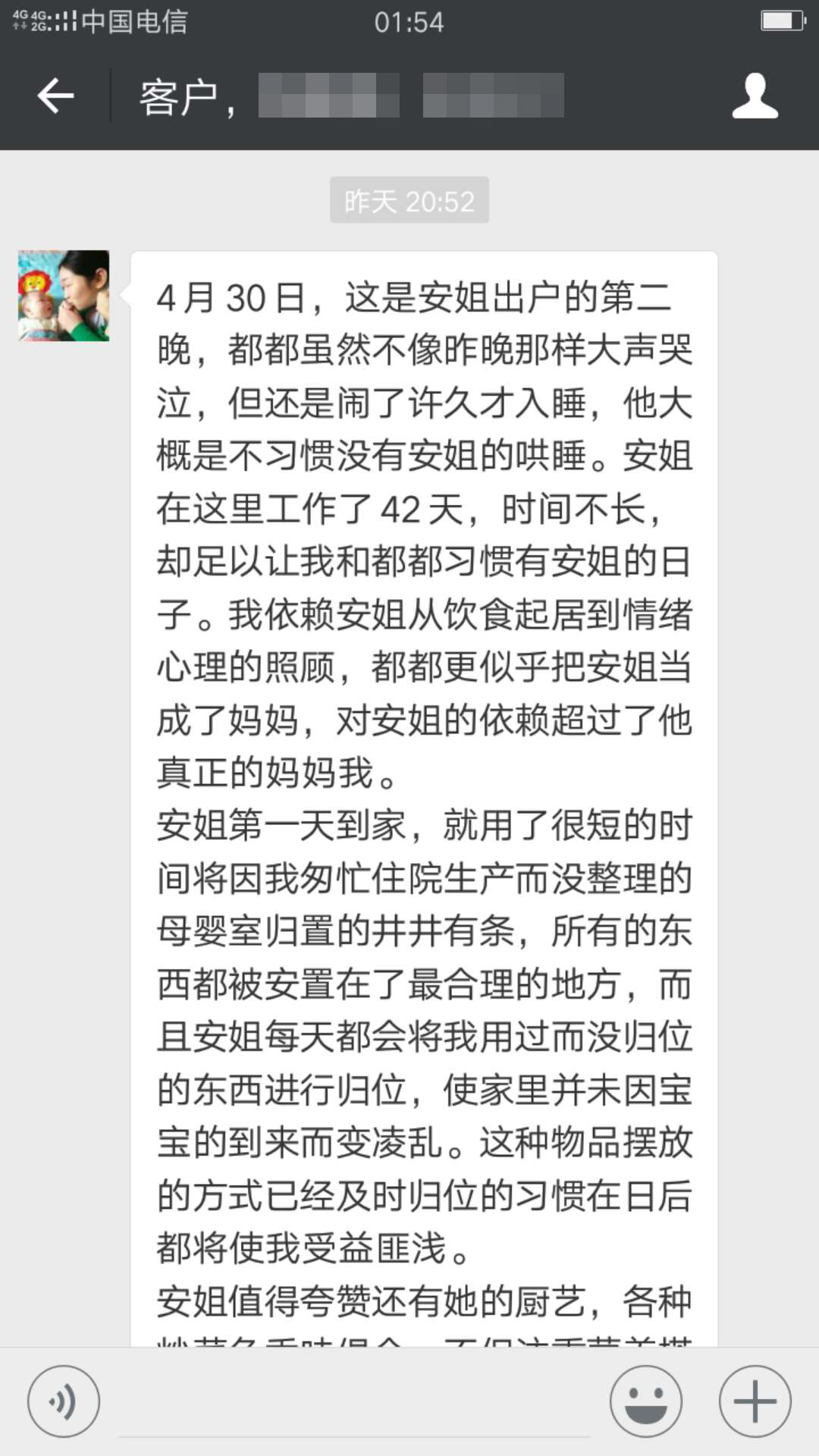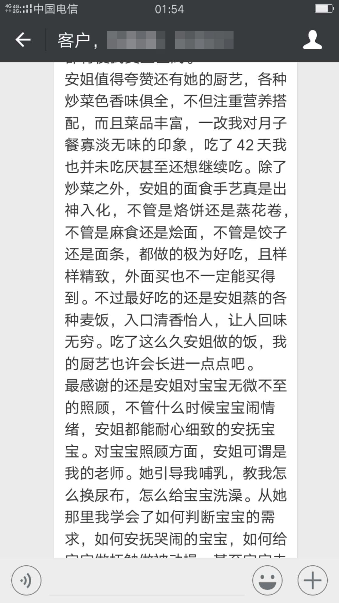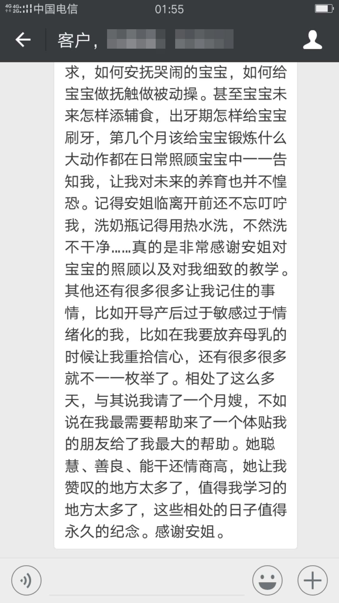 最感謝的還是安姐對寶寶無微不至的照顧,不管什么時候寶寶鬧情緒,安姐都能耐心細致的安撫寶寶。對寶寶照顧方面,安姐可謂是我的老師。她引導我哺乳,教我怎么換尿布,怎么給寶寶洗澡。從她那里我學會了如何判斷寶寶的需求,如何安撫哭鬧的寶寶,如何給寶寶做撫觸做被動操。甚至寶寶未來怎樣添輔食,出牙期怎樣給寶寶刷牙,第幾個月該給寶寶鍛煉什么大動作都在日常照顧寶寶中一一告知我,讓我對未來的養育也并不惶恐。記得安姐臨離開前還不忘叮嚀我,洗奶瓶記得用熱水洗,不然洗不干凈,…真的是非常感謝安姐對寶寶的照顧以及對我細致的教學其他還有很多很多讓我記住的事情,比如開導產后過于敏感過于情緒化的我,比如在我要放棄母乳的時候讓我重拾信心,還有很多很多就不一—枚舉了。相處了這么多天,與其說我請了一個月嫂,不如說在我最需要幫助來了一個體貼我的朋友給了我最大的幫助。她聰慧、善良、能干還情商高,她讓我贊嘆的地方太多了,值得我學習的地方太多了,這些相處的日子值得永久的紀念。感謝安姐。