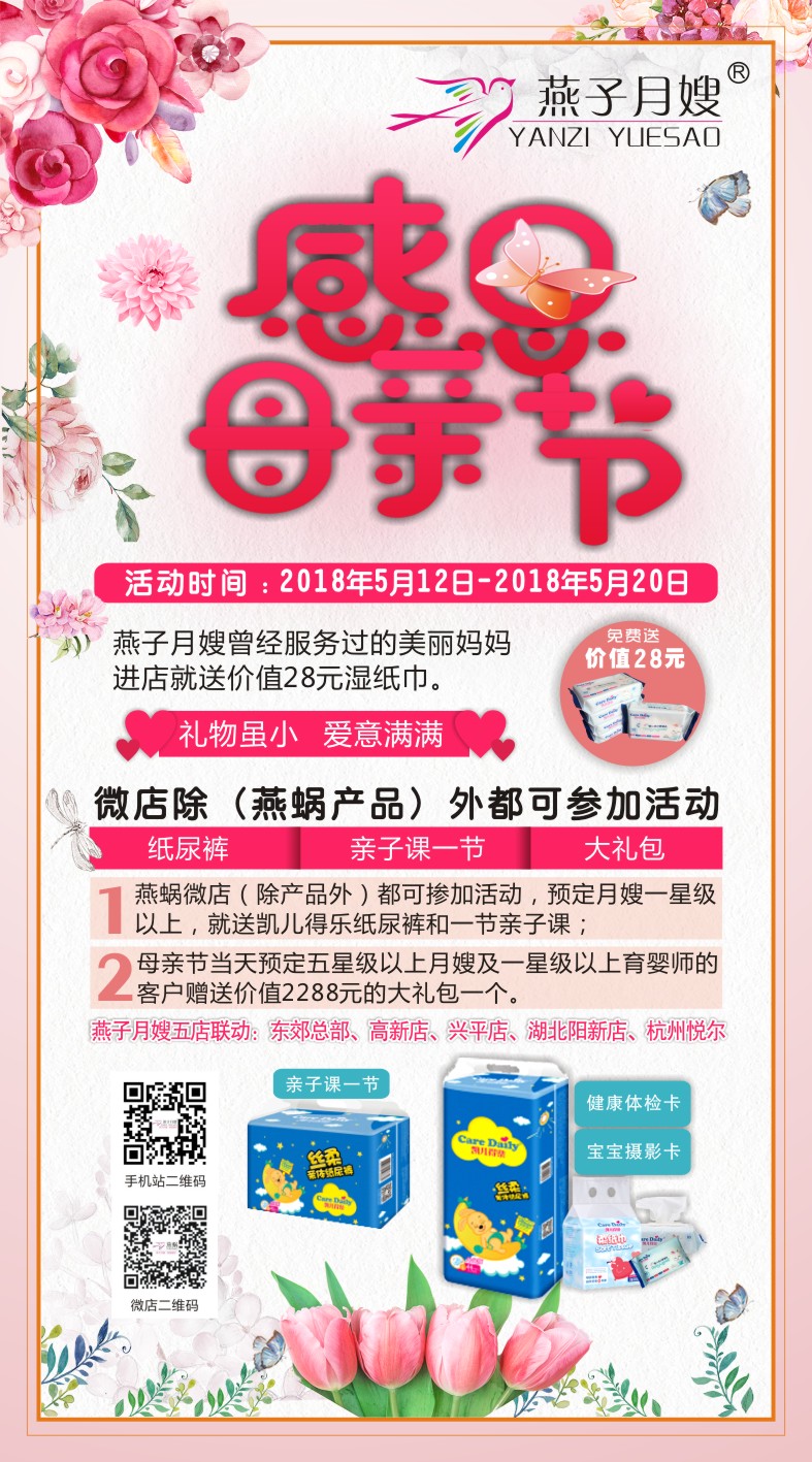為了迎接母親節,燕子月嫂準備了小禮品,燕子月嫂曾經服務過的美麗媽媽們進店就免費贈送價值28元濕紙巾,禮物雖小,愛意滿滿!