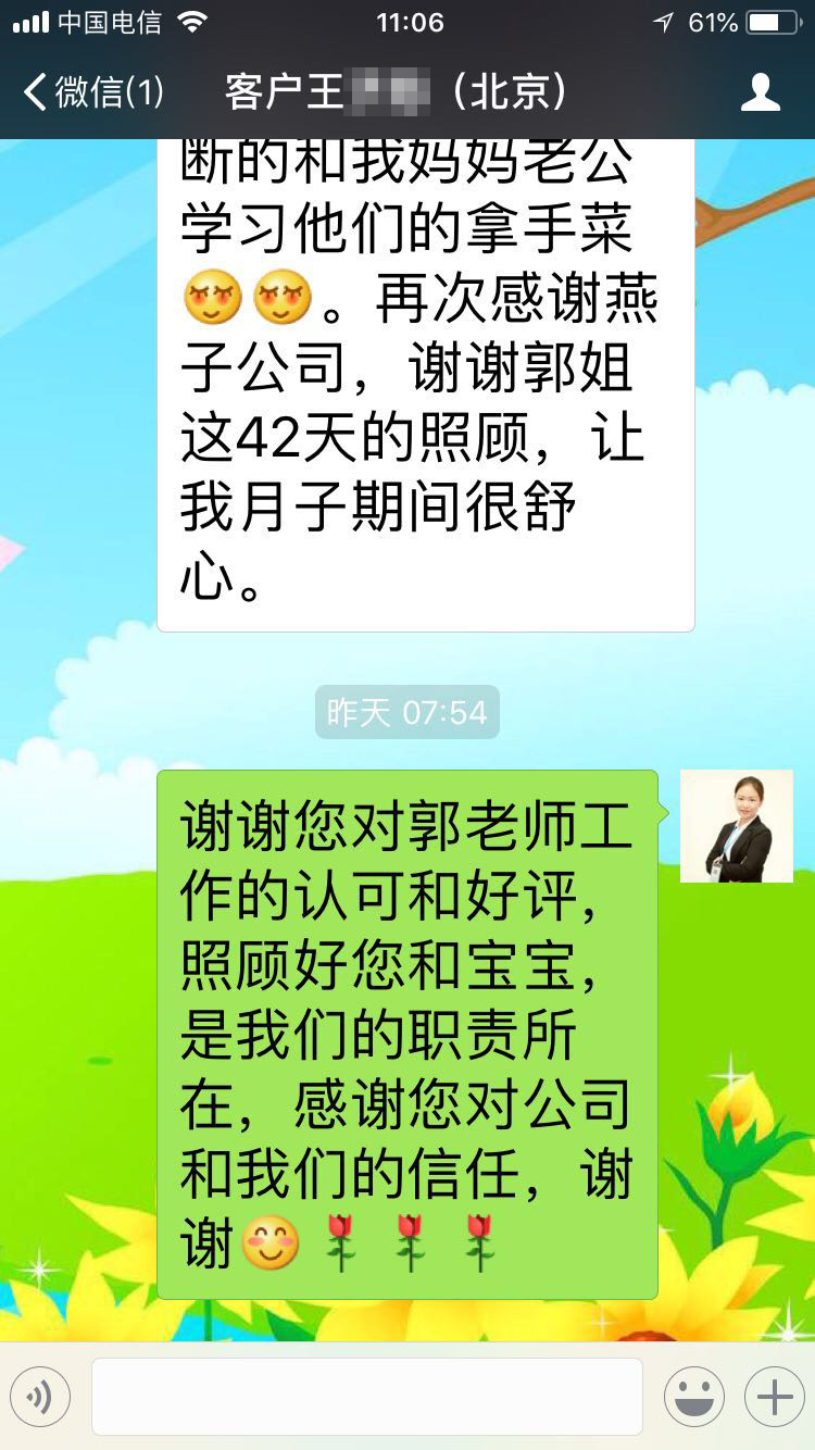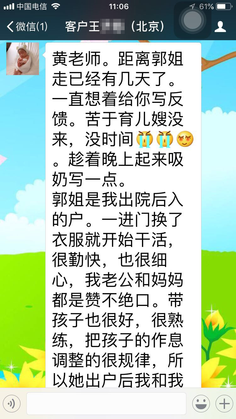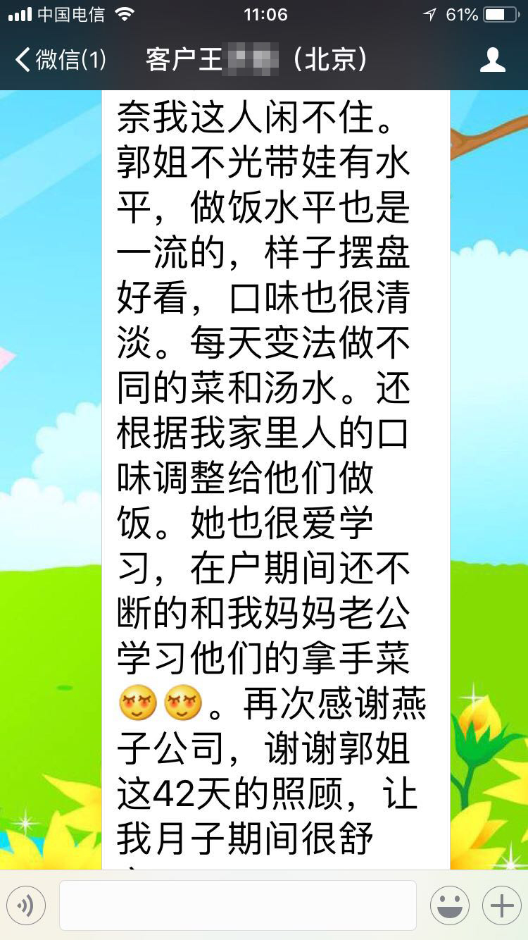 郭姐是我出院后入的戶。一進門換了衣服就開始干活,很勤快,也很細心,我老公和媽媽都是贊不絕口。帶孩子也很好,很熟練,把孩子的作息調整的很規律,所以她出戶后我和我媽媽帶起來還是比較輕松的。開奶手法也很好,我出院當天就趕緊給我開奶,讓寶寶正確的含接乳頭,所以我都沒有經歷過開奶,堵奶,乳頭皸裂這些痛,就順利的度過了月子。剛過了30天,我媽媽有事走了幾天,郭姐很辛苦,一個人帶孩子做飯搞衛生,我稍微干點活活動多了郭姐就說你不要干,多休息。無奈我這人閑不住。郭姐不光帶娃有水平,做飯水平也是一流的,樣子擺盤好看,口味也很清淡。每天變法做不同的菜和湯水。還根據我家里人的口味調整給他們做飯。她也很愛學習,在戶期間還不斷的和我媽媽老公學習他們的拿手菜。再次感謝燕子公司,謝謝郭姐這42天的照顧,讓我月子期間很舒心。
