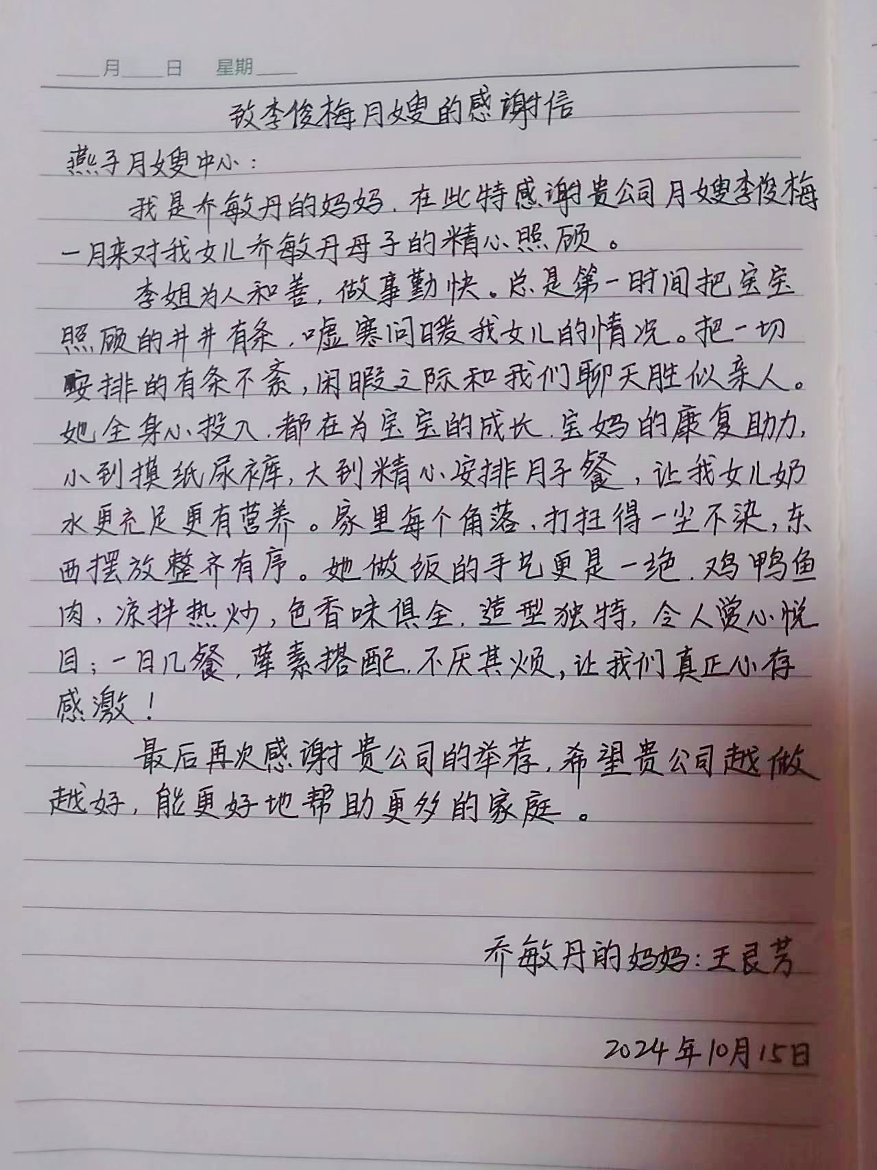 我是喬敏丹的媽媽,在此特感謝貴公司月嫂李均梅一月來對我女兒喬敏丹母子的精心照顧。
