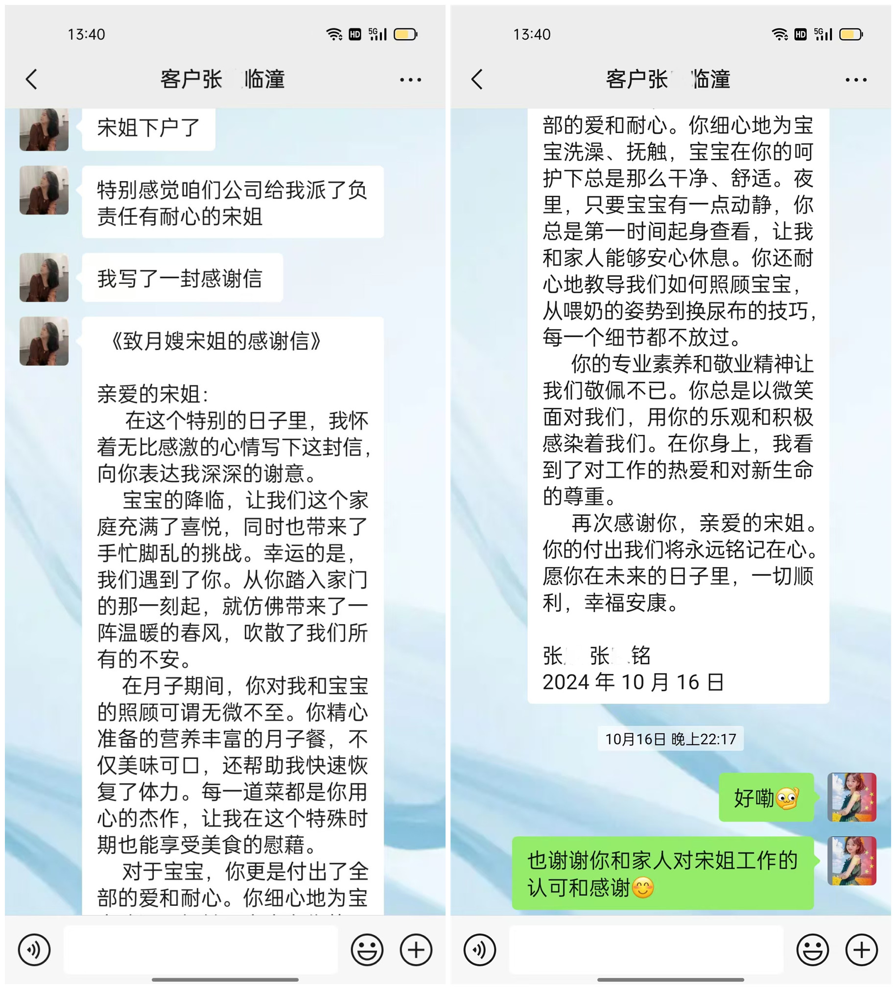 致燕子月嫂宋群英姐的感謝信:
