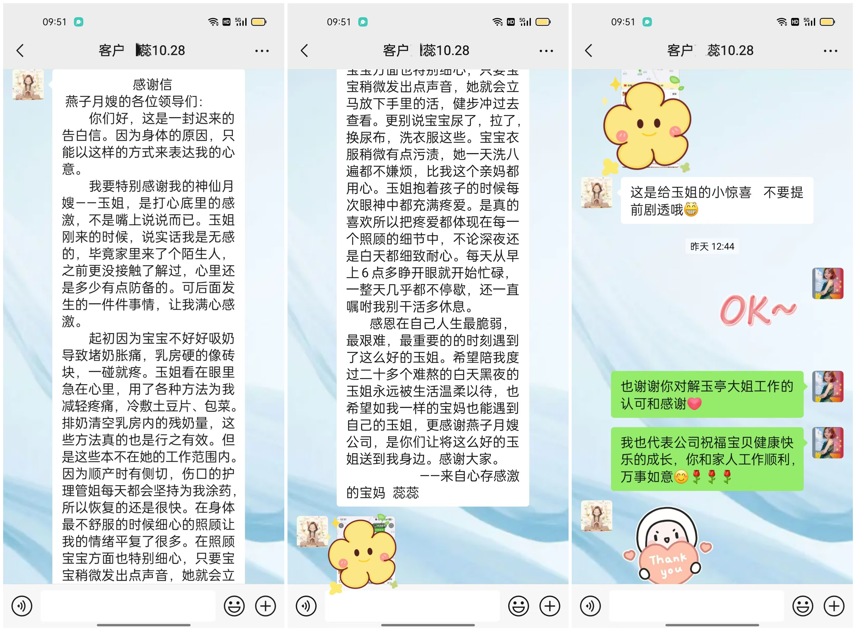 感恩在自己人生最脆弱,最艱難,最重要的的時刻遇到了這么好的玉姐。希望陪我度過二十多個難熬的白天黑夜的玉姐永遠被生活溫柔以待,也希望如我一樣的寶媽也能遇到自己的玉姐,更感謝燕子月嫂公司,是你們讓將這么好的玉姐送到我身邊。感謝大家。