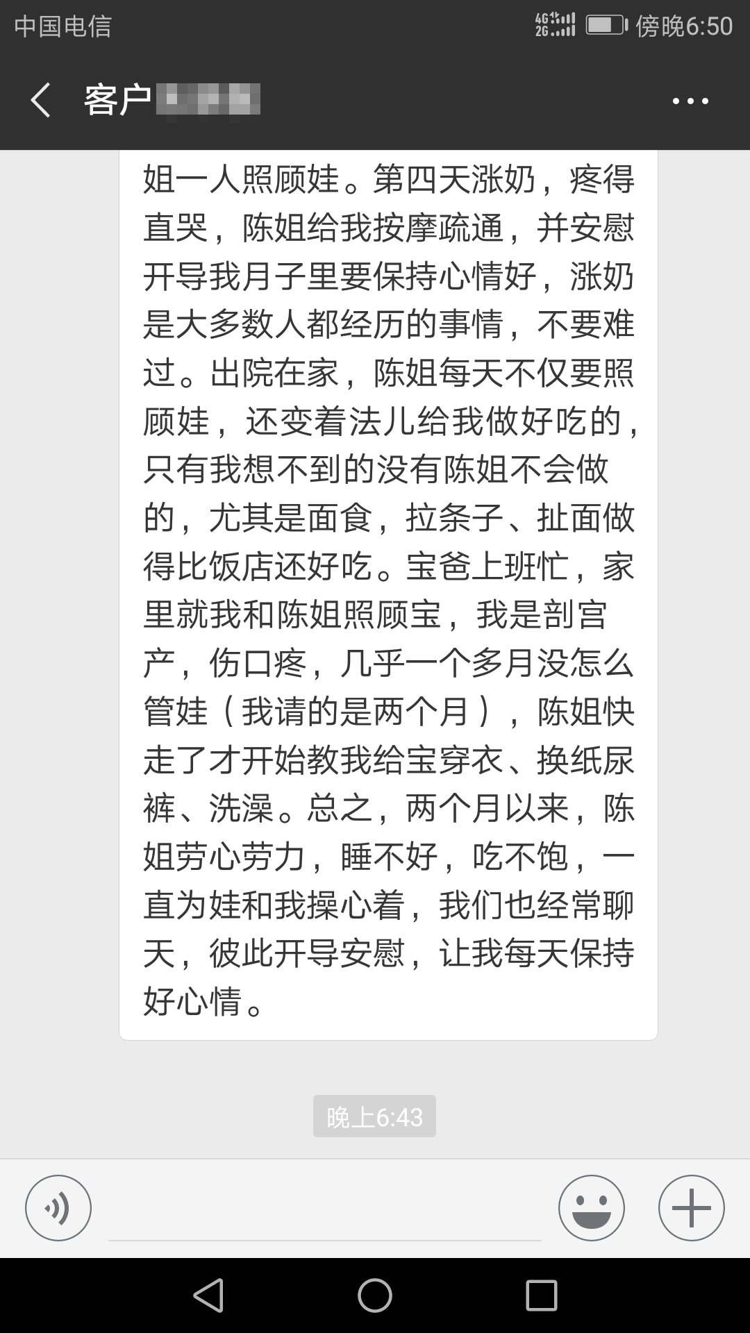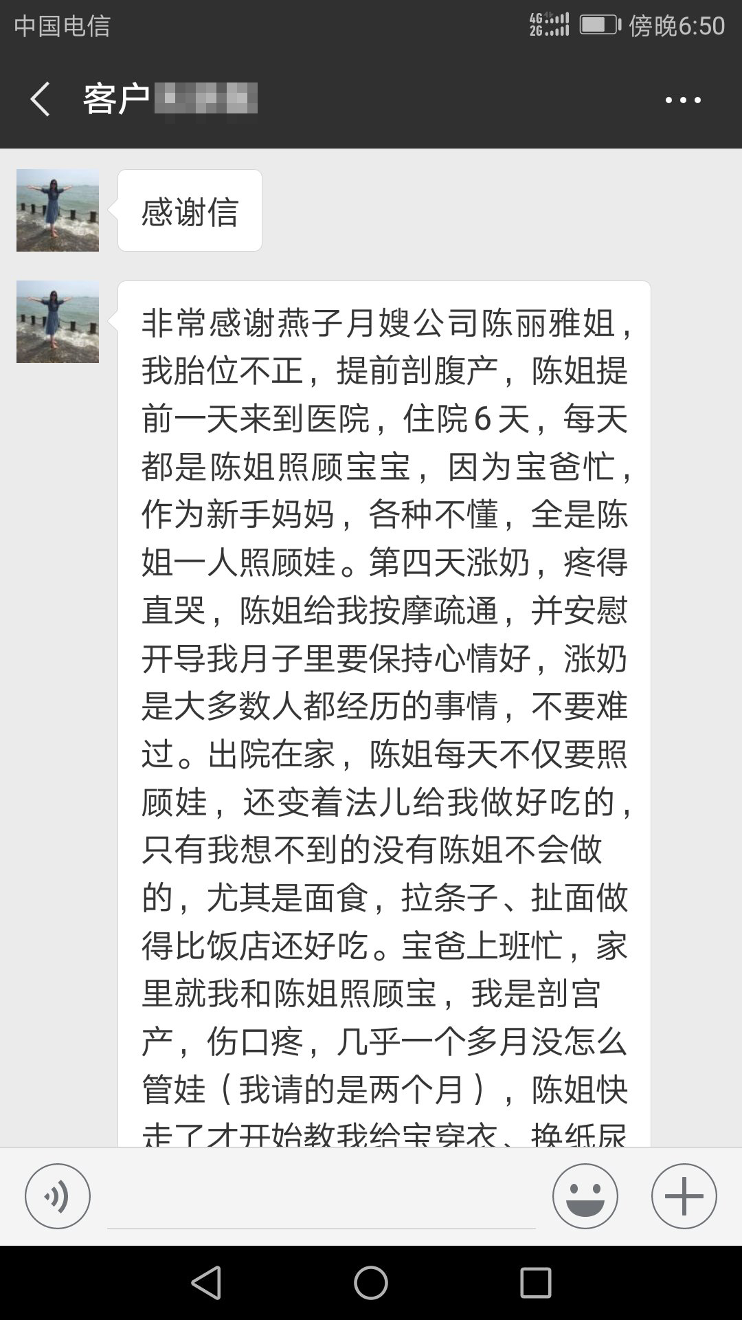 客戶給月嫂陳利婭的感謝信