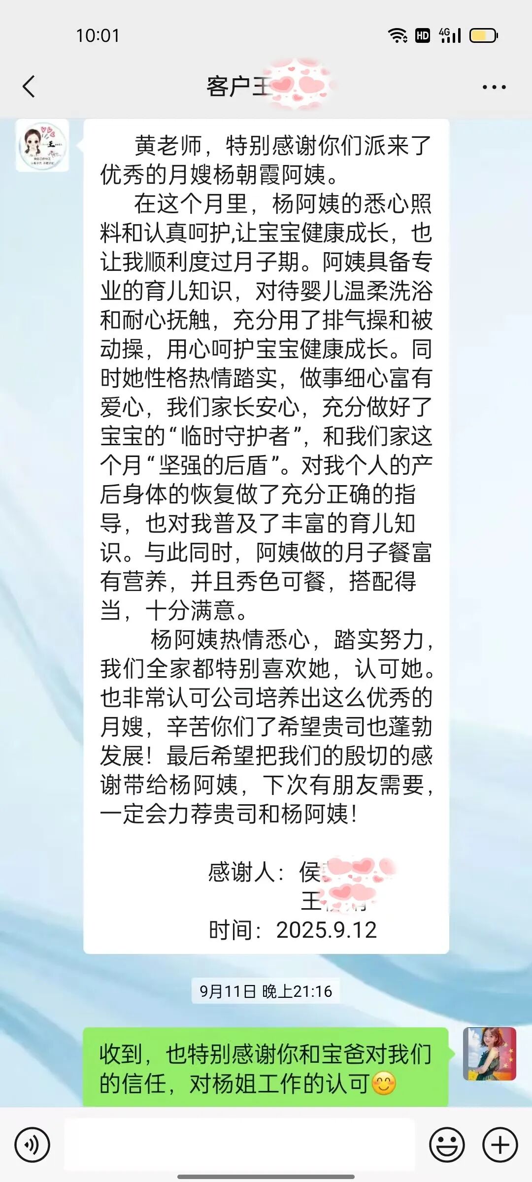 黃老師,特別感謝你們派來了優秀的月嫂楊朝霞阿姨。