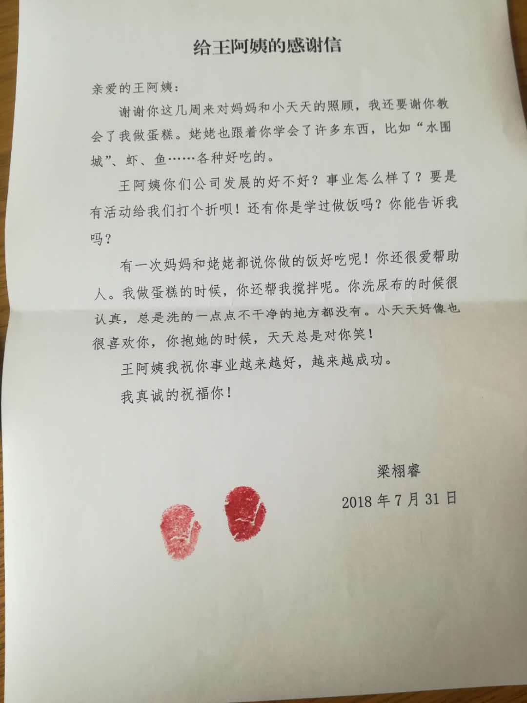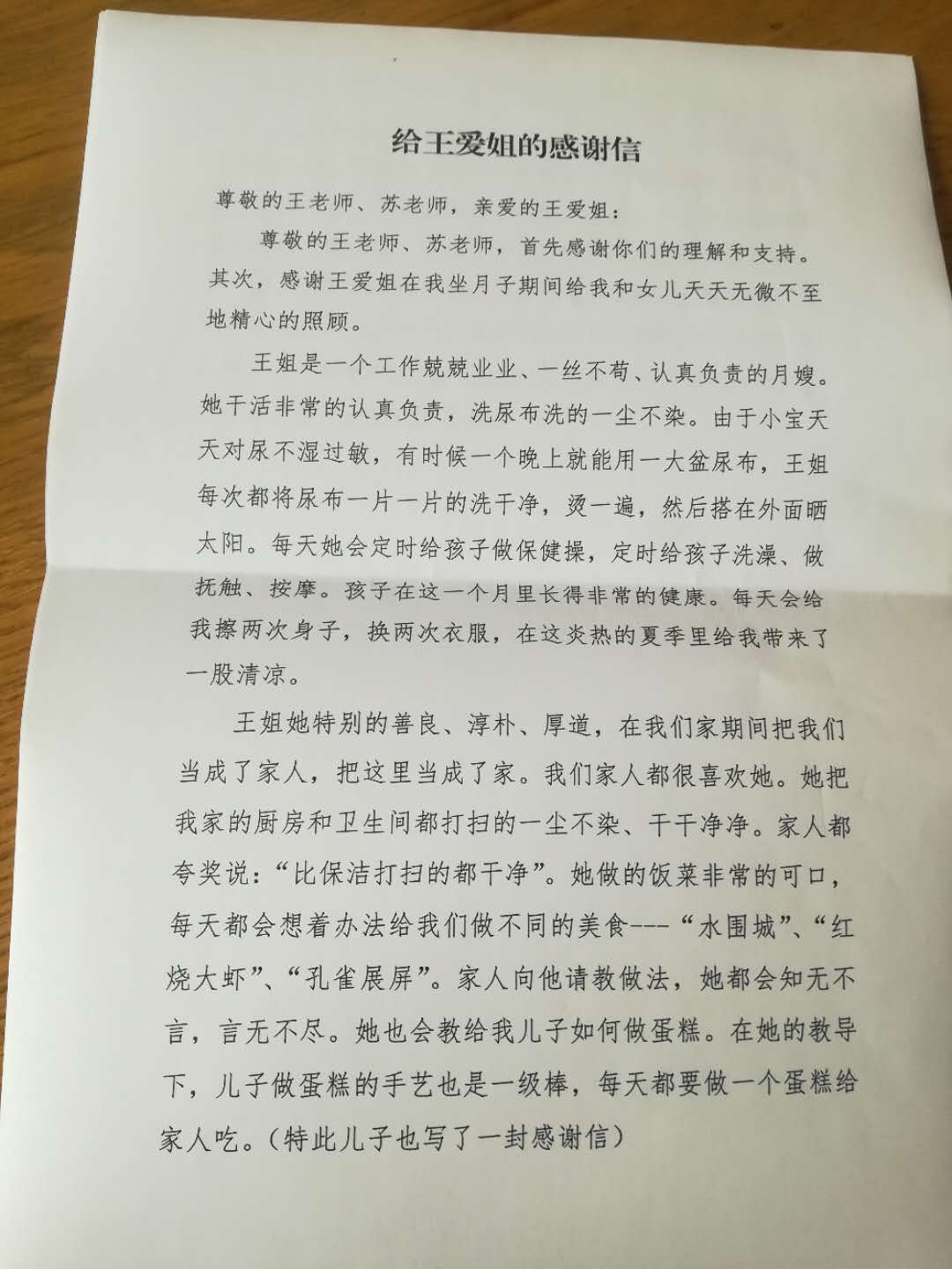 尊敬的王老師、蘇老師,親愛的王愛姐尊敬的王老師、蘇老師,首先感謝你們的理解和支持其次,感謝王愛姐在我坐月子期間給我和女兒天天無微不至地精心的照顧。