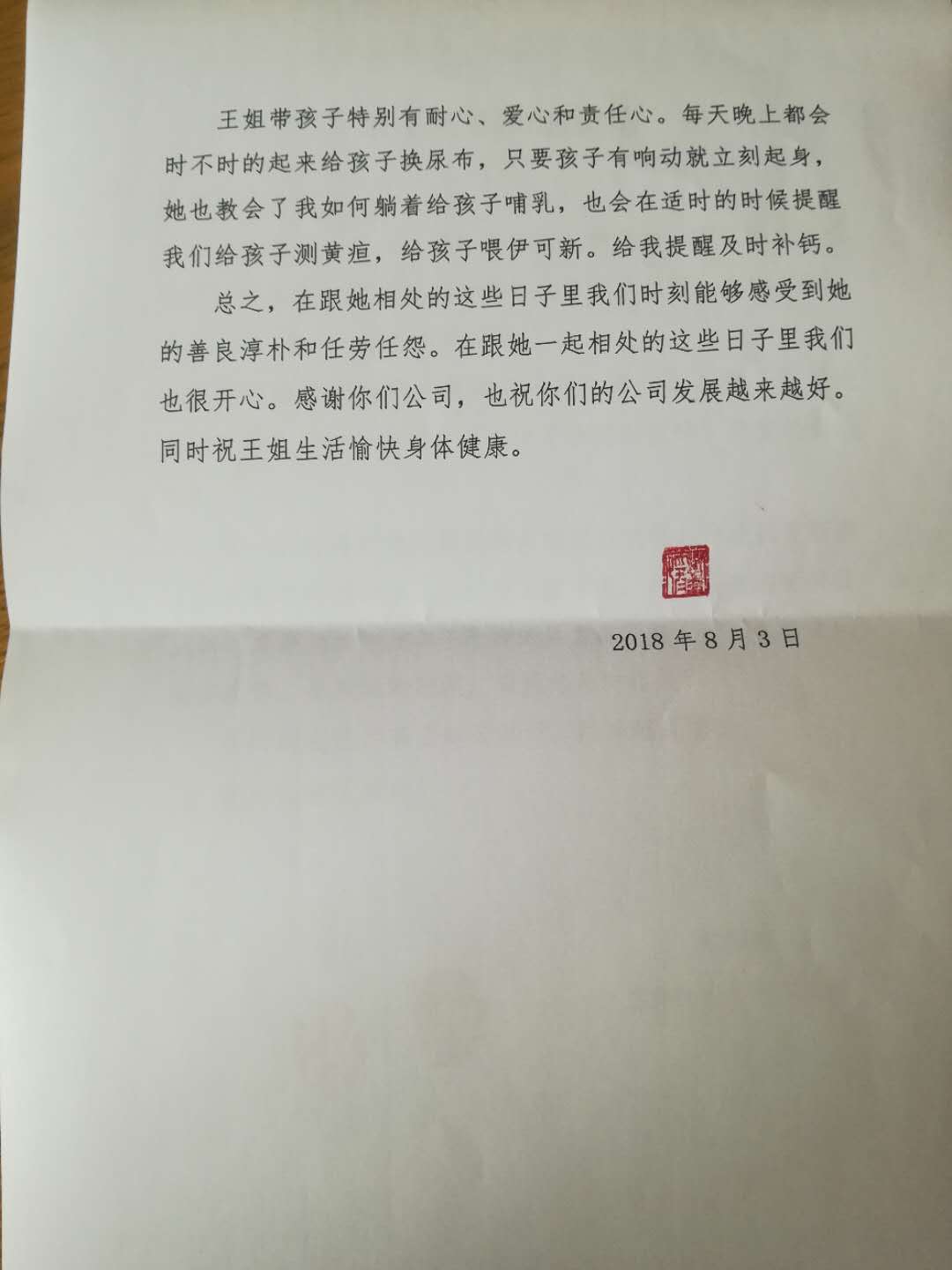 王姐帶孩子特別有耐心、愛心和責任心。每天晚上都會時不時的起來給孩子換尿布,只要孩子有響動就立刻起身,她也教會了我如何躺著給孩子哺乳,也會在適時的時候提醒我們給孩子測黃疸,給孩子喂伊可新。給我提醒及時補鈣。