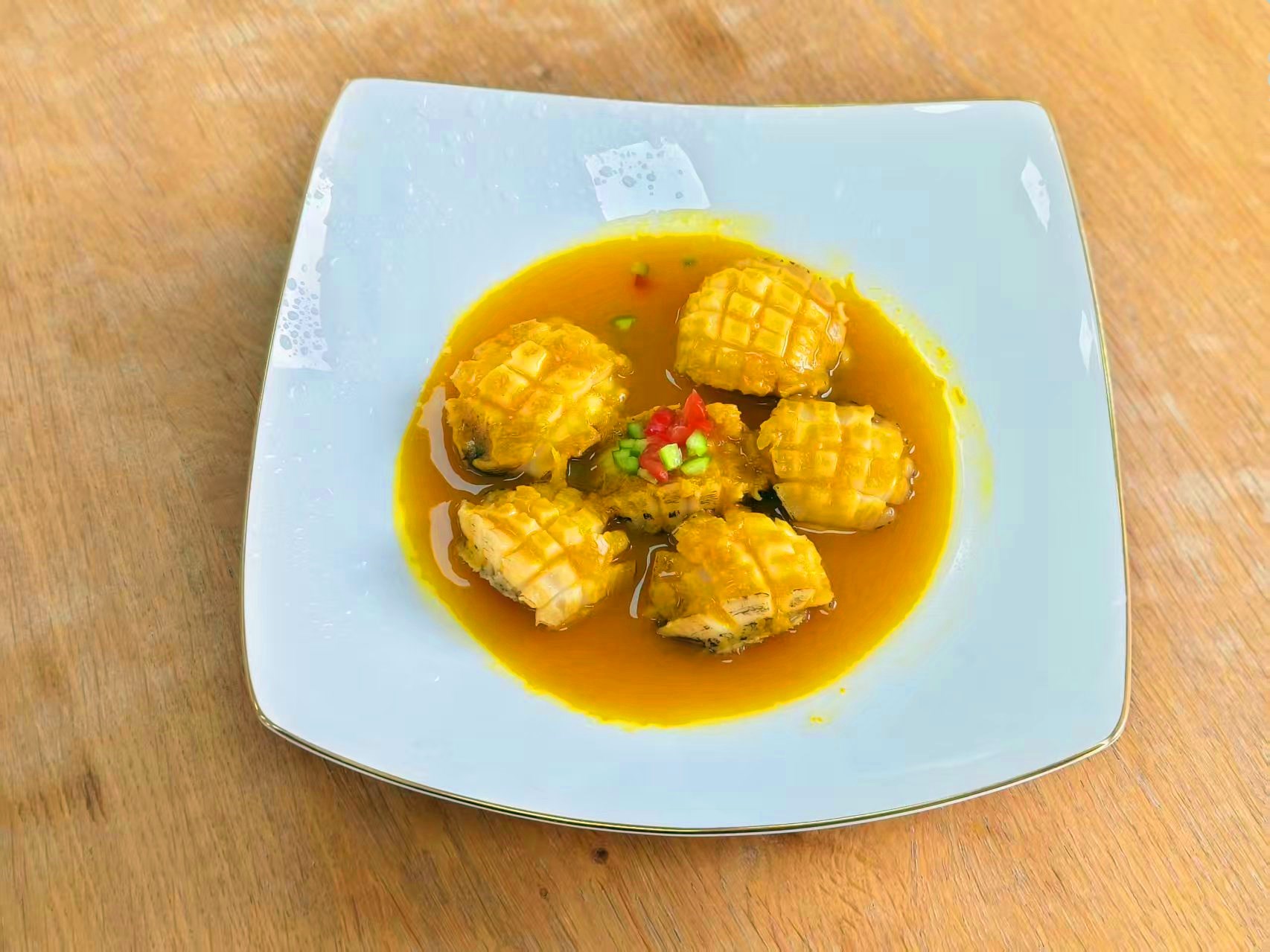 3、把完整的鮑魚,切出十字花刀,放入盤中備用。