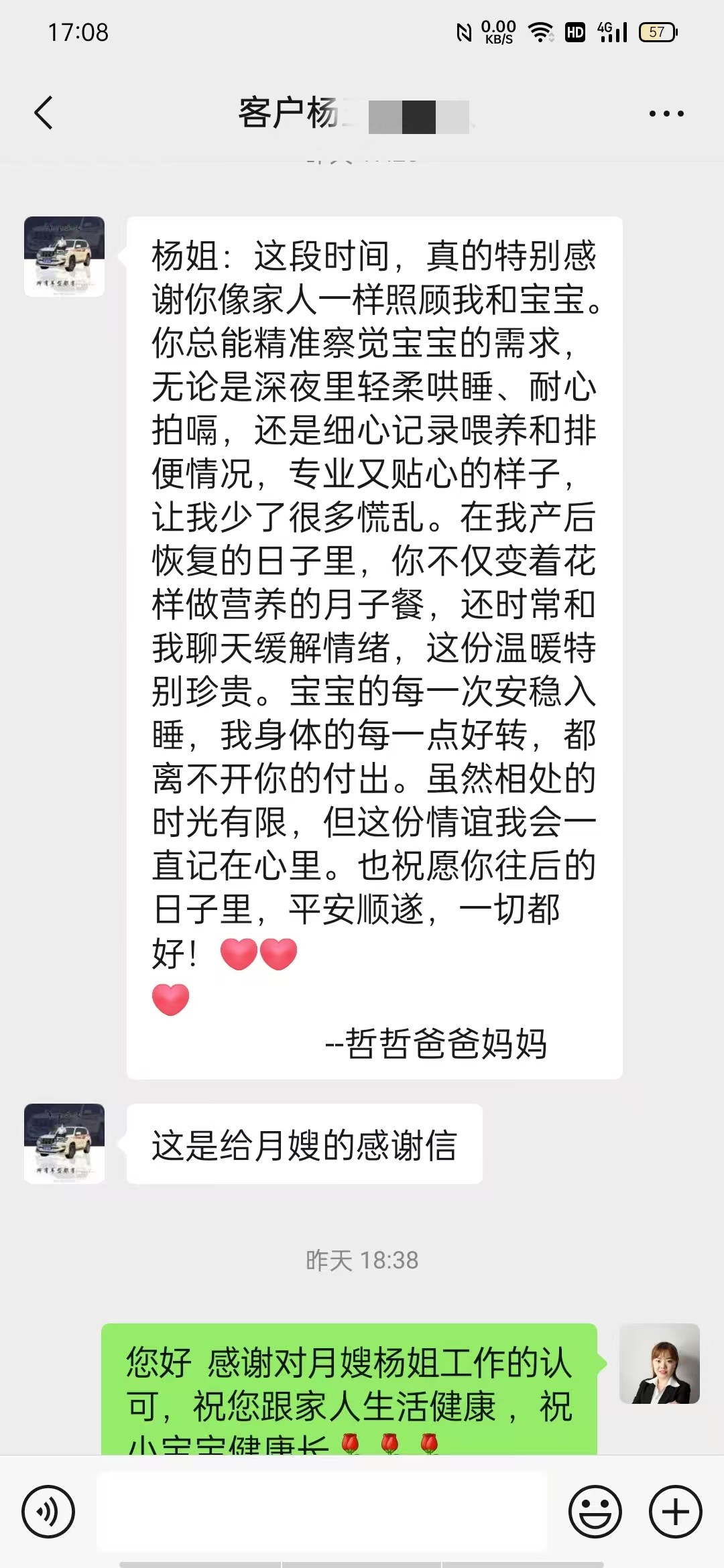 楊姐:這段時間,真的特別感謝你像家人一樣照顧我和寶寶。你總能精準察覺寶寶的需求,無論是深夜里輕柔哄睡、耐心拍嗝,還是細心記錄喂養和排便情況,專業又貼心的樣子,讓我少了很多慌亂。在我產后恢復的日子里,你不僅變著花樣做營養的月子餐,還時常和我聊天緩解情緒,這份溫暖特別珍貴。寶寶的每一次安穩入睡,我身體的每一點好轉,都離不開你的付出。雖然相處的時光有限,但這份情誼我會一直記在心里。也祝愿你往后的日子里,平安順遂,一切都好!