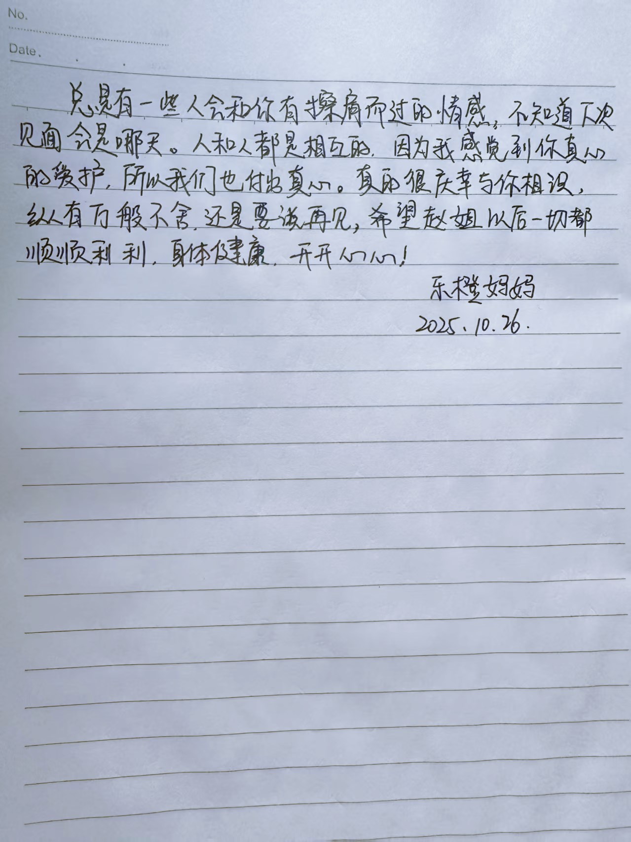 總是有一些人會(huì)和你有擦肩而過(guò)的情感,不知道下次見(jiàn)面會(huì)是哪天。人和人都是相互的,因?yàn)槲腋杏X(jué)到你真心的愛(ài)護(hù),所以我們也付出真心。真的很慶幸與你相識(shí),縱有萬(wàn)般不舍,還是要說(shuō)再見(jiàn),希望趙姐以后一切都順順利利,身體健康,開(kāi)開(kāi)心心!