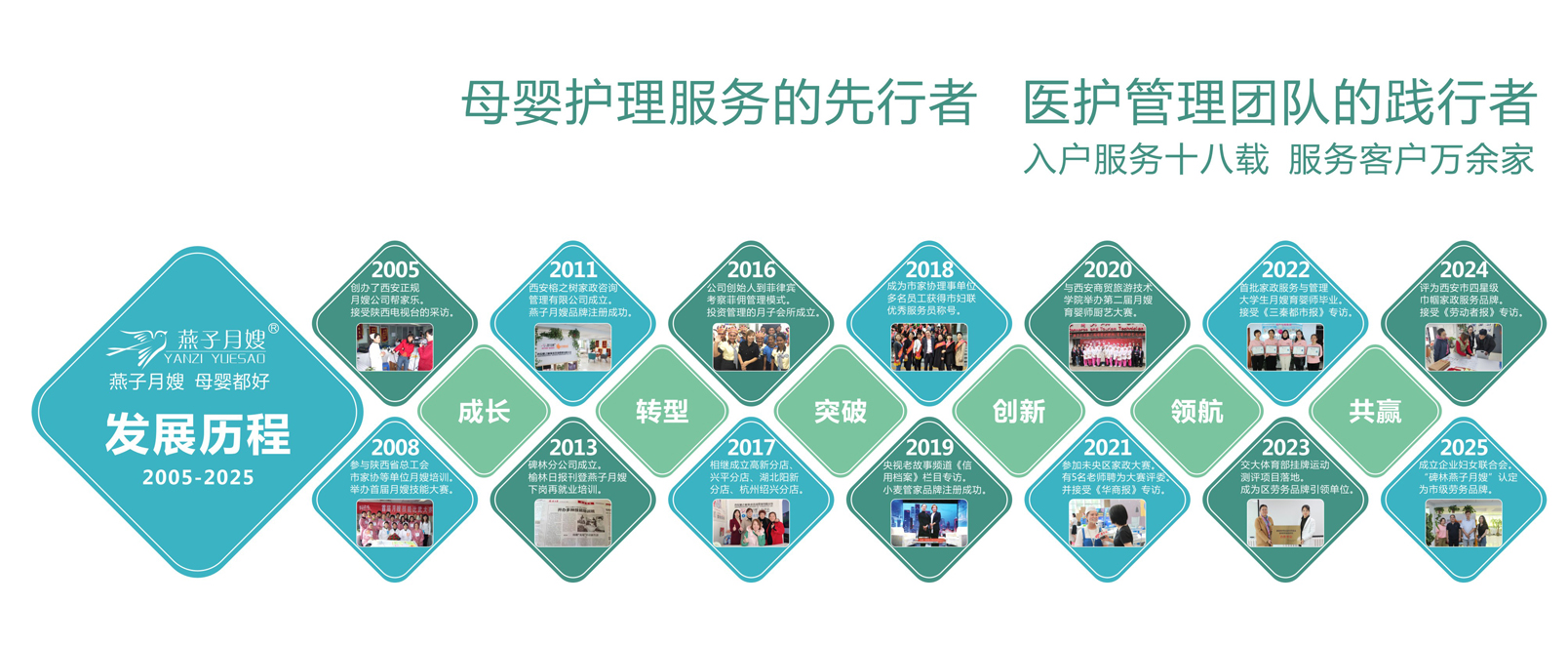 二十年風(fēng)雨歷程,“以人為本、專業(yè)熱忱、服務(wù)至上”的宗旨早已融入我們的血脈。這份堅守,讓我們贏得了“陜西省家庭服務(wù)業(yè)協(xié)會常務(wù)理事單位”的認(rèn)可,更讓我們的創(chuàng)始人與品牌,先后榮獲“中國家庭服務(wù)業(yè)先進(jìn)工作者”及“誠信企業(yè)”的殊榮。信任,是燕子月嫂最珍視的資產(chǎn)。正因如此,我們的金牌月嫂團隊得以服務(wù)省部級領(lǐng)導(dǎo)家庭及眾多公眾人物,服務(wù)足跡從北京、上海、深圳延伸至新西蘭、新加坡、柬埔寨等海外地區(qū),讓源自中國的專業(yè)護(hù)理標(biāo)準(zhǔn),贏得世界的信賴。
