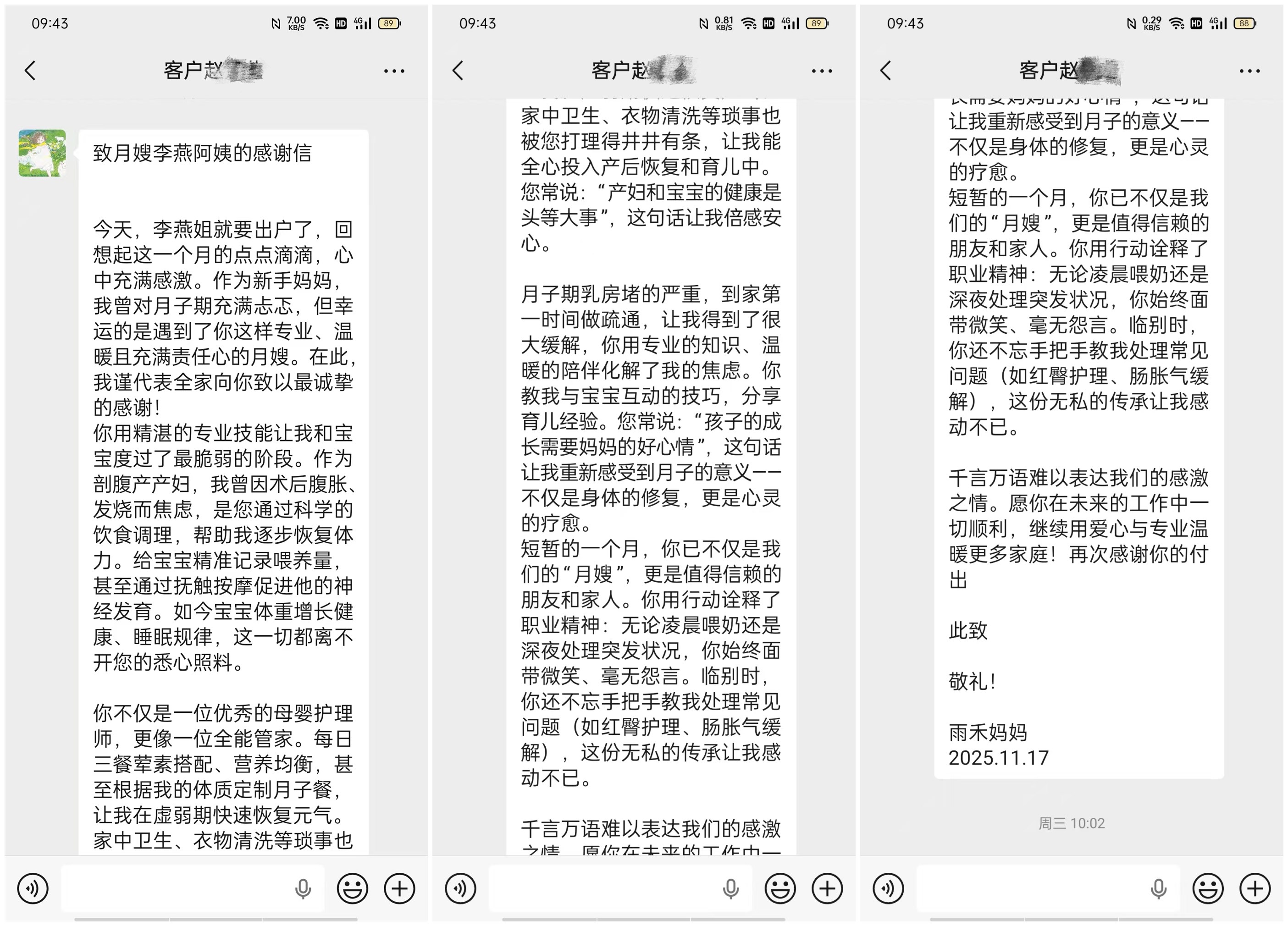 今天,李燕姐就要出戶了,回想起這一個月的點點滴滴,心中充滿感激。作為新手媽媽,我曾對月子期充滿忐忑,但幸運的是遇到了你這樣專業、溫暖且充滿責任心的月嫂。在此,我謹代表全家向你致以最誠摯的感謝!