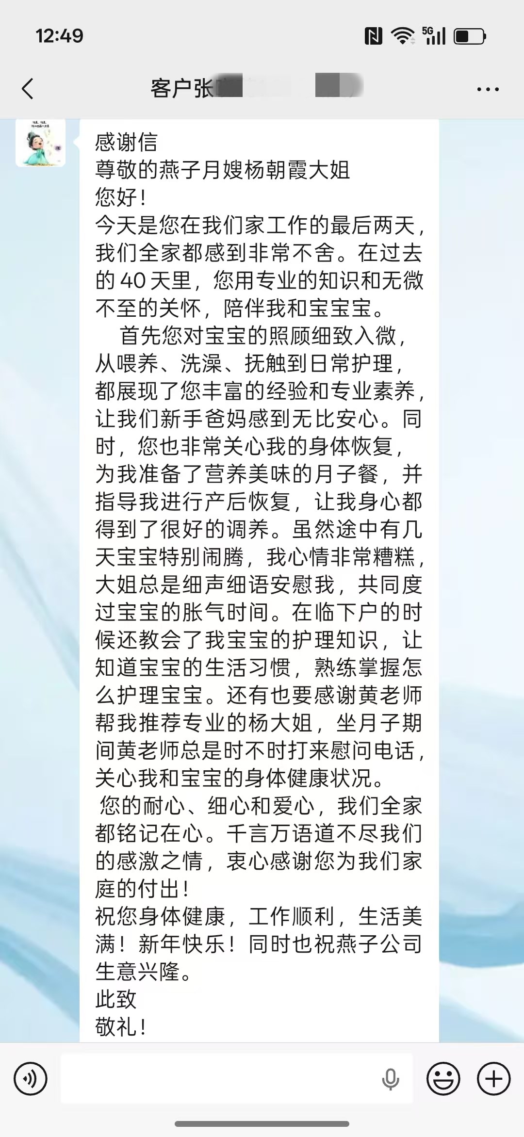尊敬的燕子月嫂楊朝霞大姐您好!
