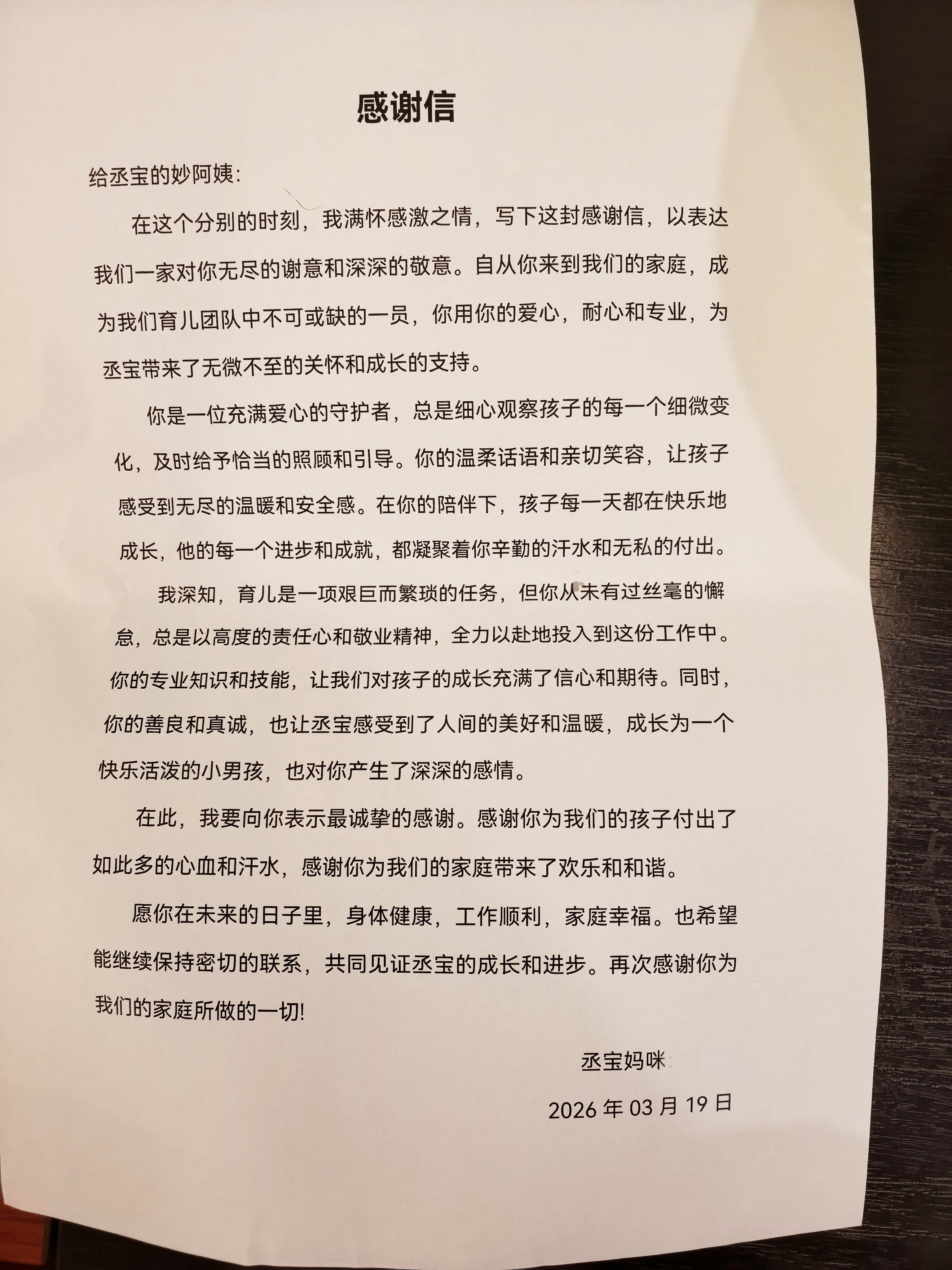在這個分別的時刻,我滿懷感激之情,寫下這封感謝信,以表達我們一家對你無盡的謝意和深深的敬意。自從你來到我們的家庭,成為我們育兒團隊中不可或缺的一員,你用你的愛心,耐心和專業,為丞寶帶來了無微不至的關懷和成長的支持。