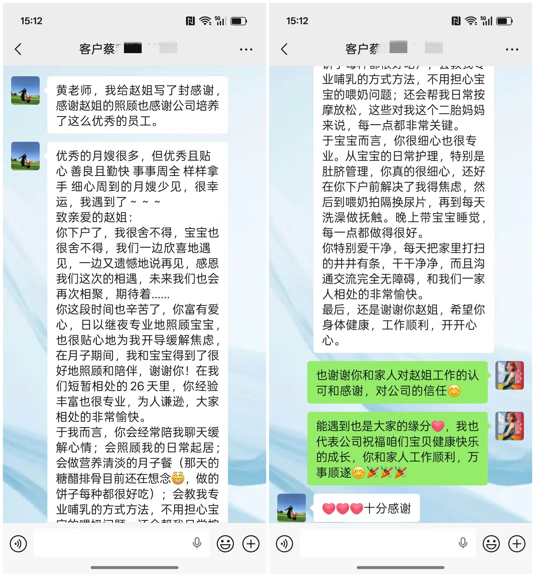 你這段時間也辛苦了,你富有愛心,日以繼夜專業地照顧寶寶,也很貼心地為我開導緩解焦慮,在月子期間,我和寶寶得到了很好地照顧和陪伴,謝謝你!在我們短暫相處的26天里,你經驗豐富也很專業,為人謙遜,大家相處的非常愉快。
