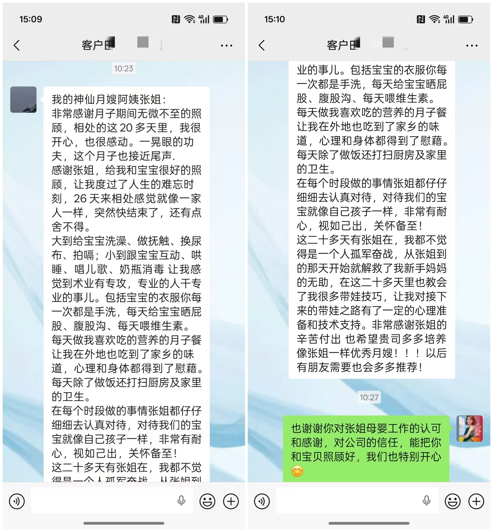 感謝張姐,給我和寶寶很好的照顧,讓我度過了人生的難忘時刻,26 天來相處感覺就像一家人一樣,突然快結(jié)束了,還有點舍不得。