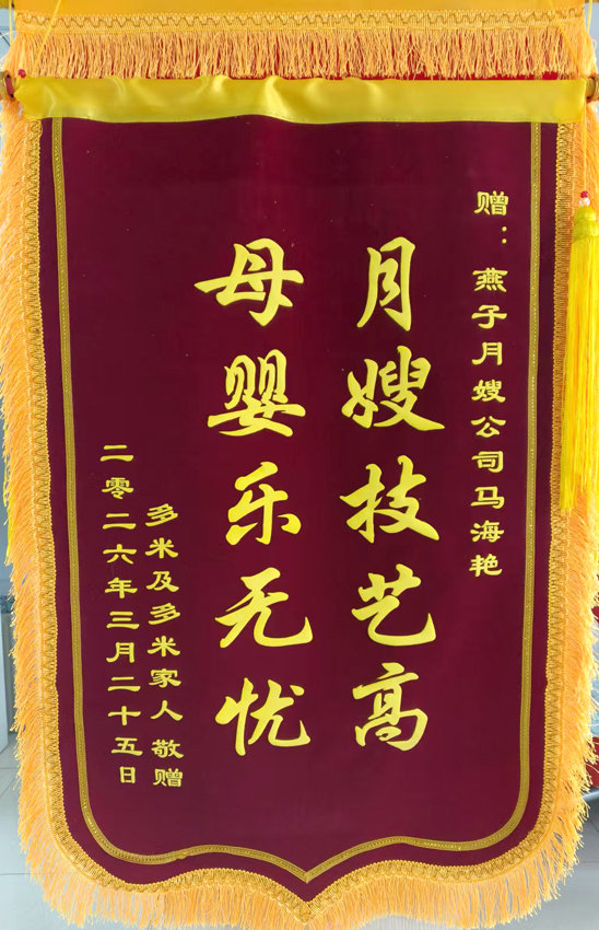 在西安母嬰護理領域“月嫂技藝高,母嬰樂無憂”這面錦旗,是客戶對西安燕子月嫂馬海艷專業服務的高度贊譽,更是燕子月嫂公司堅守品質的有力見證,藏著母嬰守護的溫情,也承載著月嫂的付出與專業。