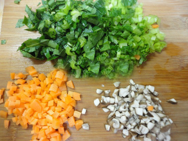 把香菇,青菜,胡蘿卜都切成碎丁狀。