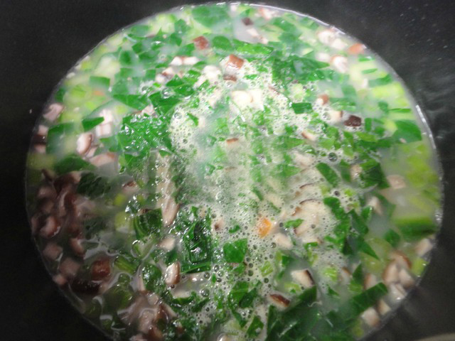 把胡蘿卜丁煮軟之后,給鍋中加入青菜丁和香菇丁,繼續煮燉到青菜變軟。