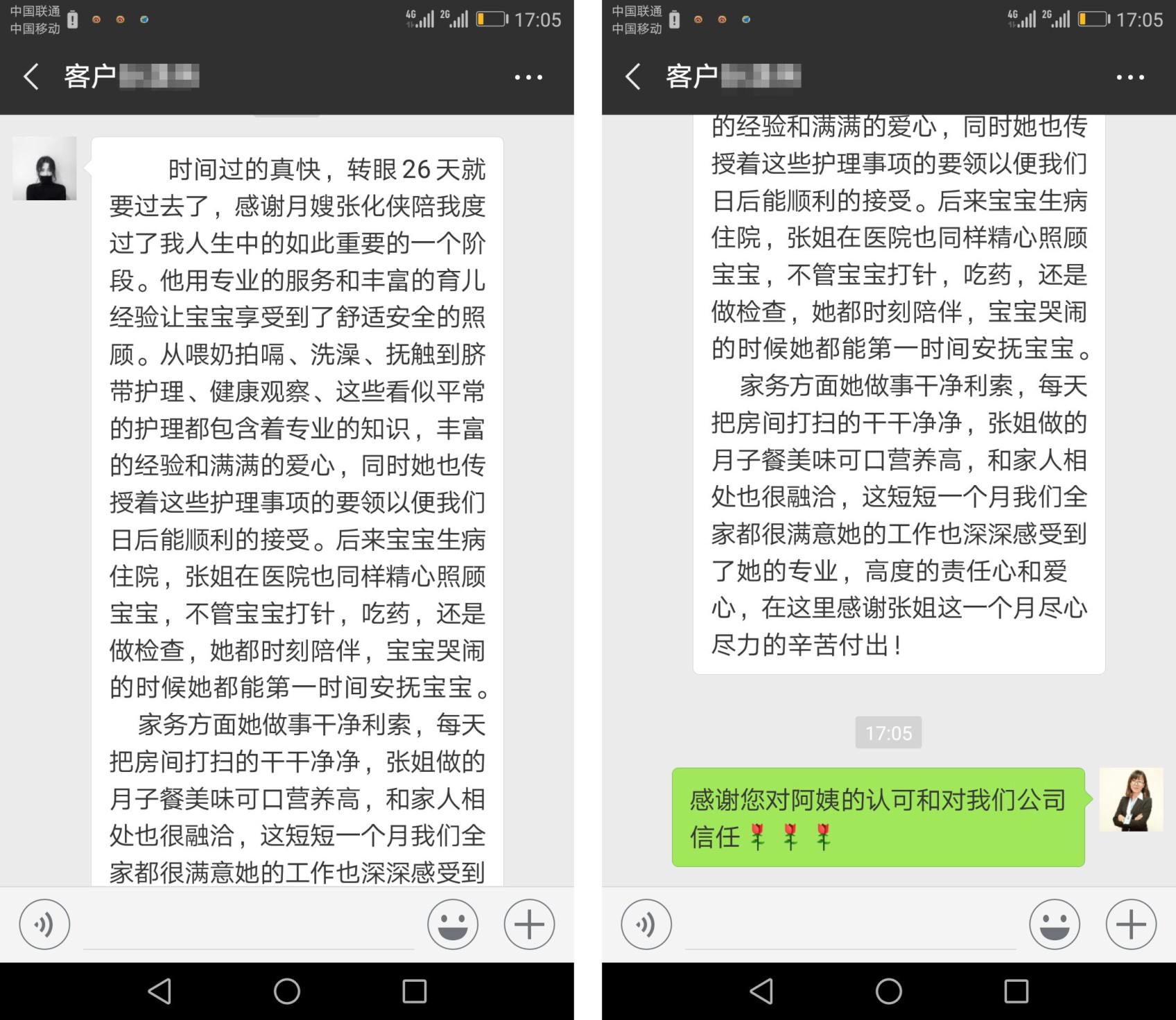 家務方面她做事干凈利索,每天把房間打掃的干千凈凈,張姐做的月子餐美味可口營養高,和家人相處也很融洽,這短短一個月我們全家都很滿意她的工作也深深感受到了她的專業,高度的責任心和愛,在這里感謝張姐這一個月盡心盡力的辛苦付出!