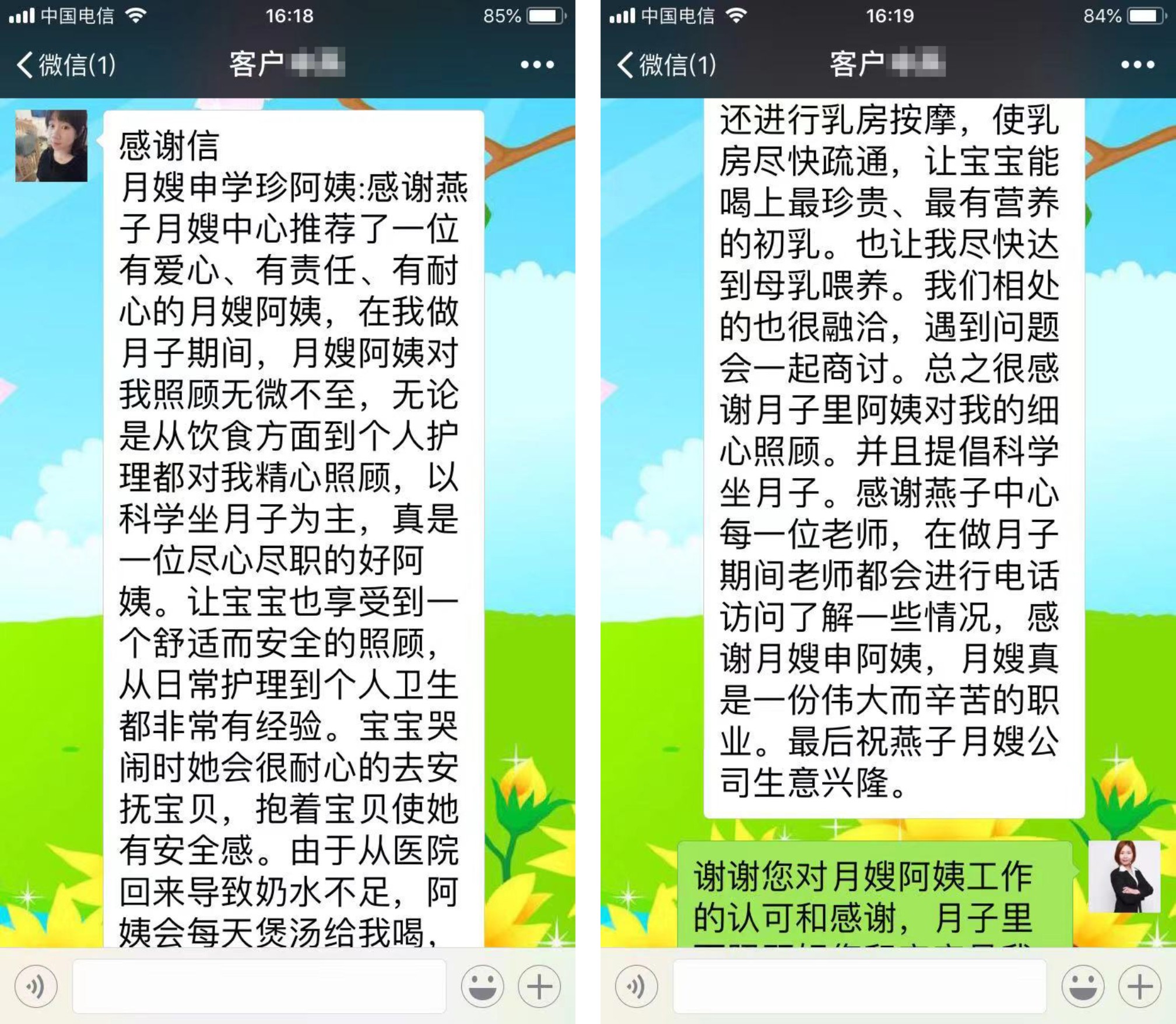 月嫂申學珍阿姨:感謝燕子月嫂中心推薦了一位有愛心、有責任、有耐心的月嫂阿姨,在我做月子期間,月嫂阿姨對我照顧無微不至,無論是從飲食方面到個人護理都對我精心照顧,以科學坐月子為主,真是一位盡心盡職的好阿姨。讓寶寶也享受到一個舒適而安全的照顧,從日常護理到個人衛(wèi)生都非常有經(jīng)驗。寶寶哭鬧時她會很耐心的去安撫寶貝,抱著寶貝使她有安全感。由于從醫(yī)院回來導致奶水不足,阿姨會每天煲湯給我喝,還進行乳房按摩,使乳房盡快疏通,讓寶寶能喝上最珍貴、最有營養(yǎng)的初乳。也讓我盡快達到母乳喂養(yǎng)。我們相處的也很融洽,遇到問題會一起商討。總之很感謝月子里阿姨對我的細心照顧。并且提倡科學坐月子。感謝燕子中心每一位老師,在做月子期間老師都會進行電話訪問了解一些情況,感謝月嫂申阿姨,月嫂真是一份偉大而辛苦的職業(yè)。最后祝燕子月嫂公司生意興隆。