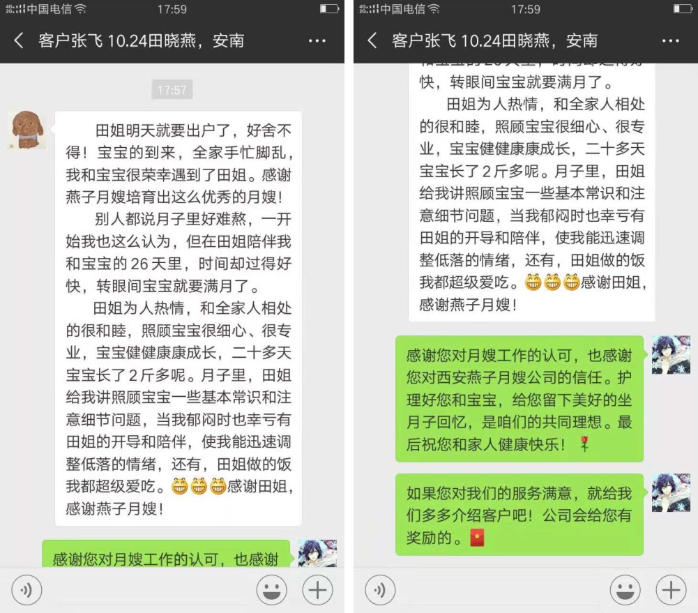 田姐為人熱情,和全家人相處的很和睦,照顧寶寶很細心、很專業,寶寶健健康康成長,二十多天寶寶長了2斤多呢。月子里,田姐給我講照顧寶寶一些基本常識和注意細節問題,當我郁悶時也幸虧有田姐的開導和陪伴,使我能迅速調整低落的情緒,還有,田姐做的飯我都超級愛吃。感謝田姐,感謝燕子月嫂!