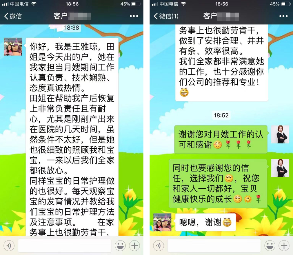 你好,我是王雅瓊,田姐是今天出的戶,她在我家擔當月嫂期間工作認真負責、技術嫻熟、態度真誠熱情。
