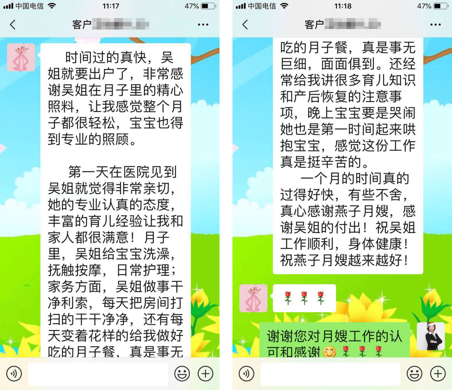 一個月的時間真的過得好快,有些不舍,真心感謝燕子月嫂,感謝吳姐的付出!祝吳姐工作順利,身體健康!祝燕子月嫂越來越好!