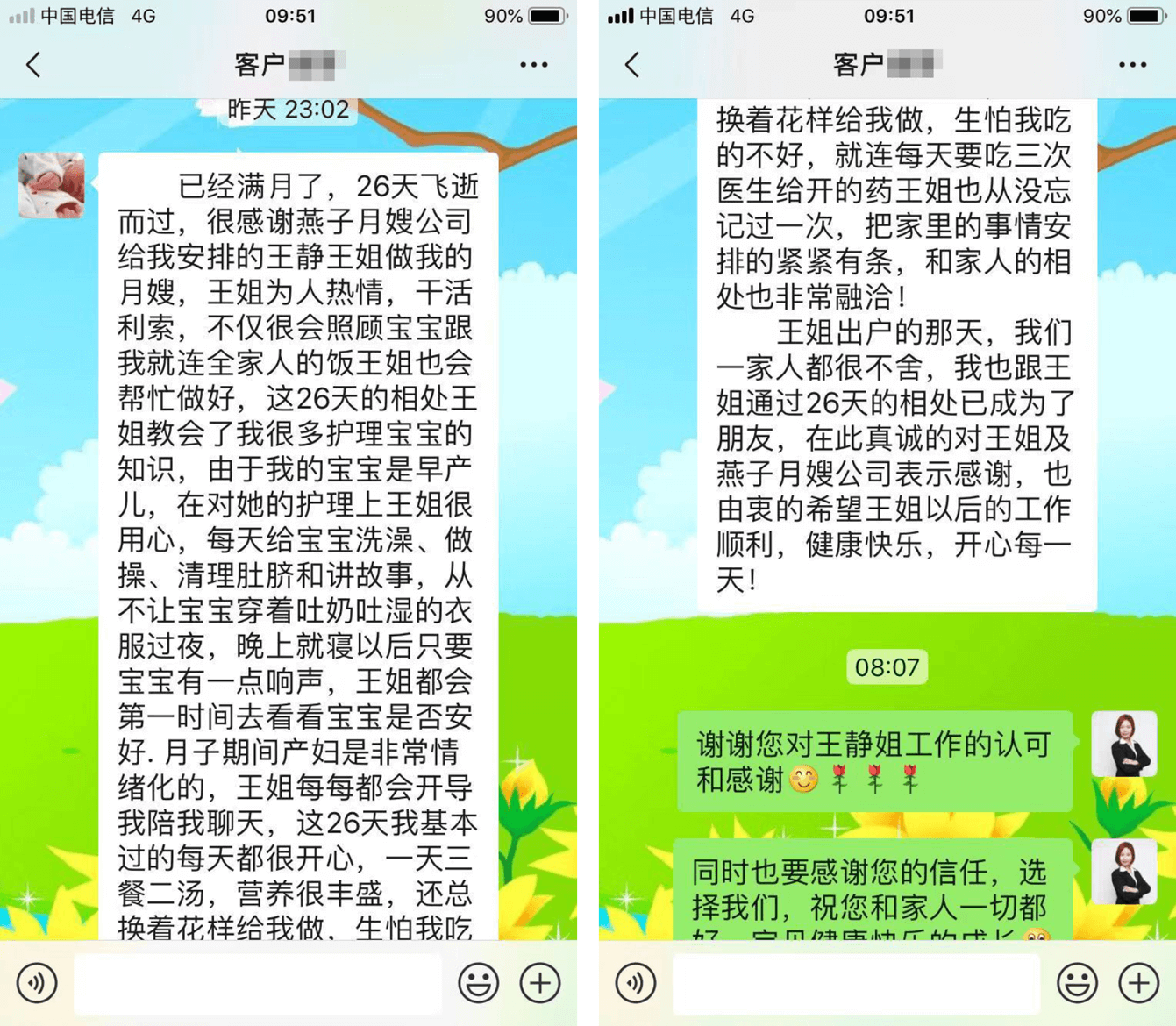王姐出戶的那天,我們一家人都很不舍,我也跟王姐通過26天的相處已成為了朋友,在此真誠的對王姐及燕子月嫂公司表示感謝,也由衷的希望王姐以后的工作順利,健康快樂,開心每一天!