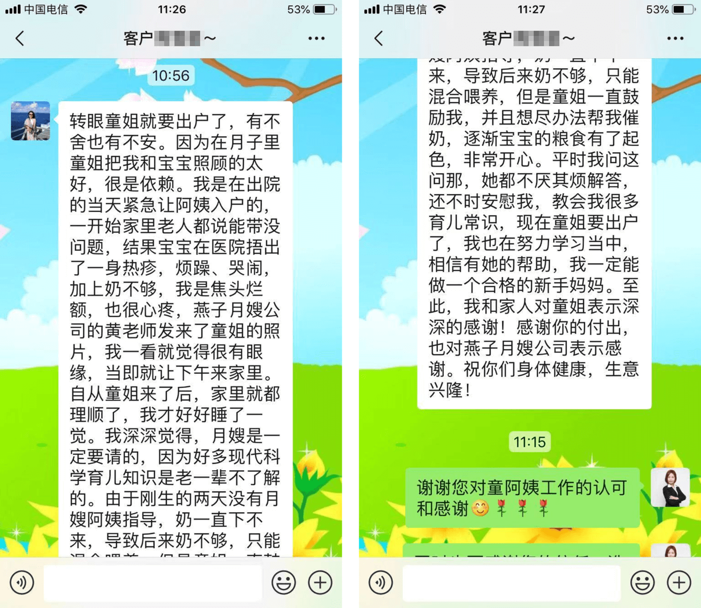 轉眼童姐就要出戶了,有不舍也有不安。因為在月子里童姐把我和寶寶照顧的太好,很是依賴。我是在出院的當天緊急讓阿姨入戶的,一開始家里老人都說能帶沒問題,結果寶寶在醫院捂出了一身熱疹,煩躁、哭鬧,加上奶不夠,我是焦頭爛額,也很心疼,燕子月嫂公司的黃老師發來了童姐的照片,我一看就覺得很有眼緣,當即就讓下午來家里。自從童姐來了后,家里就都理順了,我才好好睡了一覺。我深深覺得,月嫂是一定要請的,因為好多現代科學育兒知識是老一輩不了解的。由于剛生的兩天沒有月嫂阿姨指導,奶一直下不來,導致后來奶不夠,只能混合喂養,但是童姐一直鼓勵我,并且想盡辦法幫我催奶,逐漸寶寶的糧食有了起色,非常開心。平時我問這問那,她都不厭其煩解答,還不時安慰我,教會我很多育兒常識,現在童姐要出戶了,我也在努力學習當中,相信有她的幫助,我一定能做一個合格的新手媽媽。至此,我和家人對童姐表示深深的感謝!感謝你的付出,也對燕子月嫂公司表示感謝。祝你們身體健康,生意興隆!