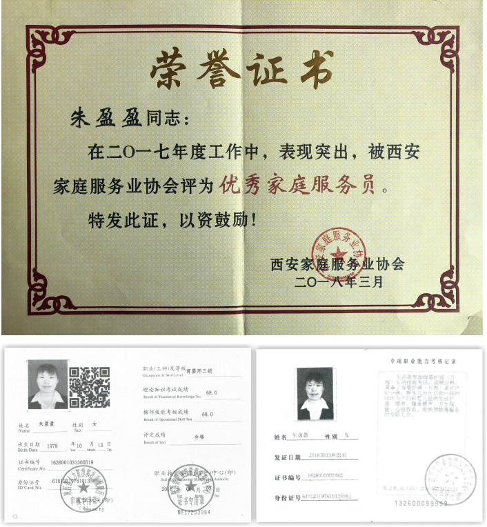 朱盈盈阿姨是一個有很強上進心的人,因不滿足自身現有技能,為進一步提高個人育嬰知識和專業技能,并于今年5月參加了蒙特梭利早教育嬰師培訓,取得了優異的成績及相關早教證書。獲得西安市“優秀家庭服務員”稱號。