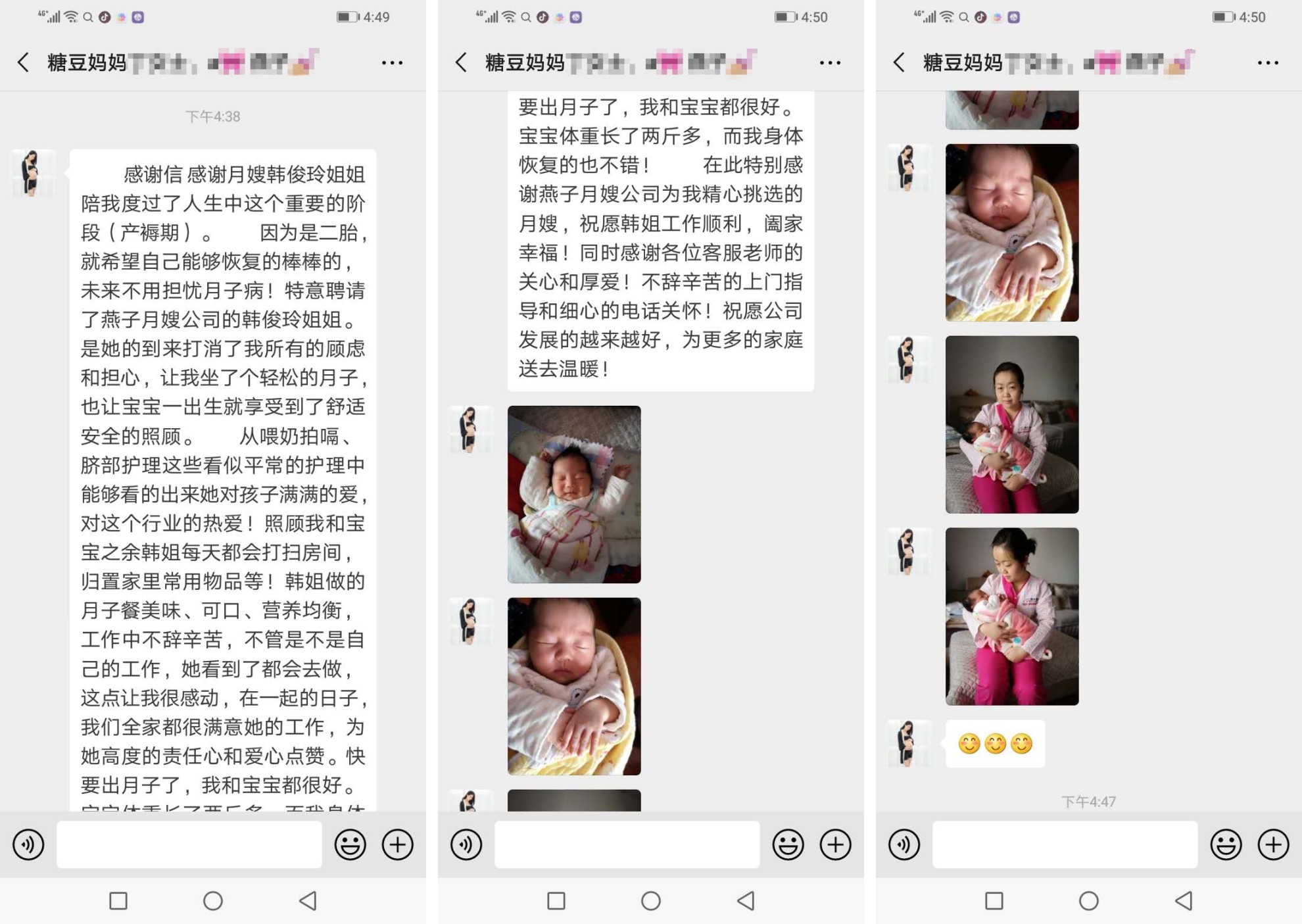 在此特別感謝燕子月嫂公司為我精心挑選的月嫂,祝愿韓姐工作順利,闔家幸福!同時感謝各位客服老師的關心和厚愛!不辭辛苦的上門指導和細心的電話關懷!祝愿公司發展的越來越好,為更多的家庭送去溫暖!