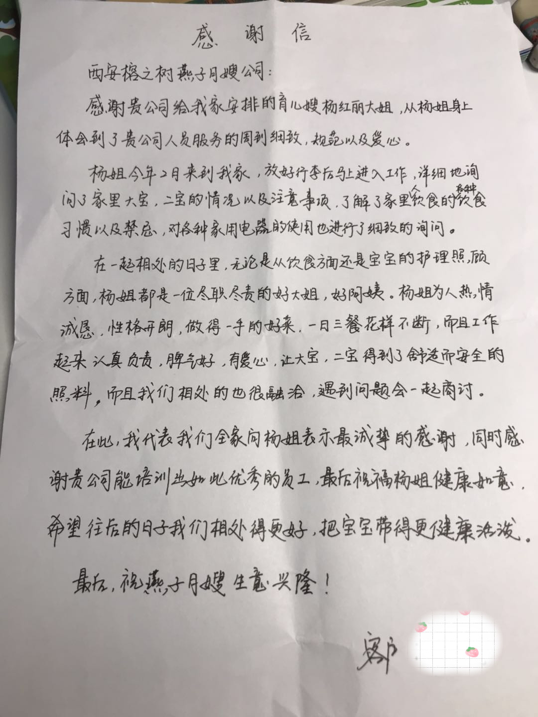 在此我代表我們全家向楊姐表示最誠摯的感謝,同時感謝貴公司能培訓出如此有優秀的員工,最后祝福楊姐健康如意,希望往后的日子里我們相處的更好,把寶寶帶的更健康活潑。