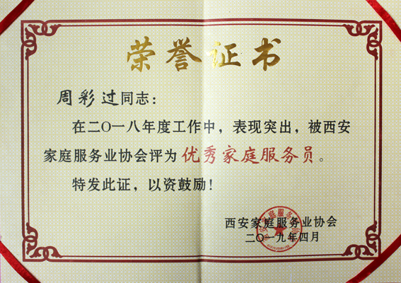 金牌月嫂周彩過榮獲“2018年度優(yōu)秀家庭服務(wù)員”稱號