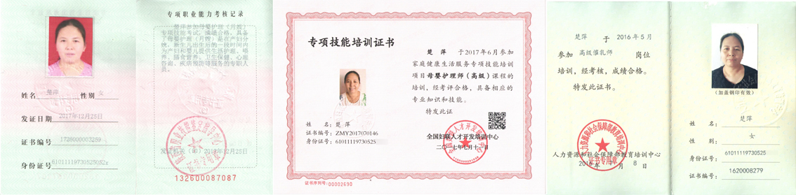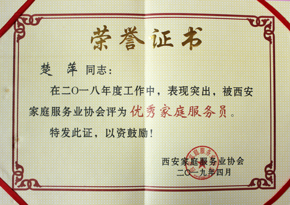 金牌月嫂楚萍榮獲“2018年度優秀家庭服務員”稱號