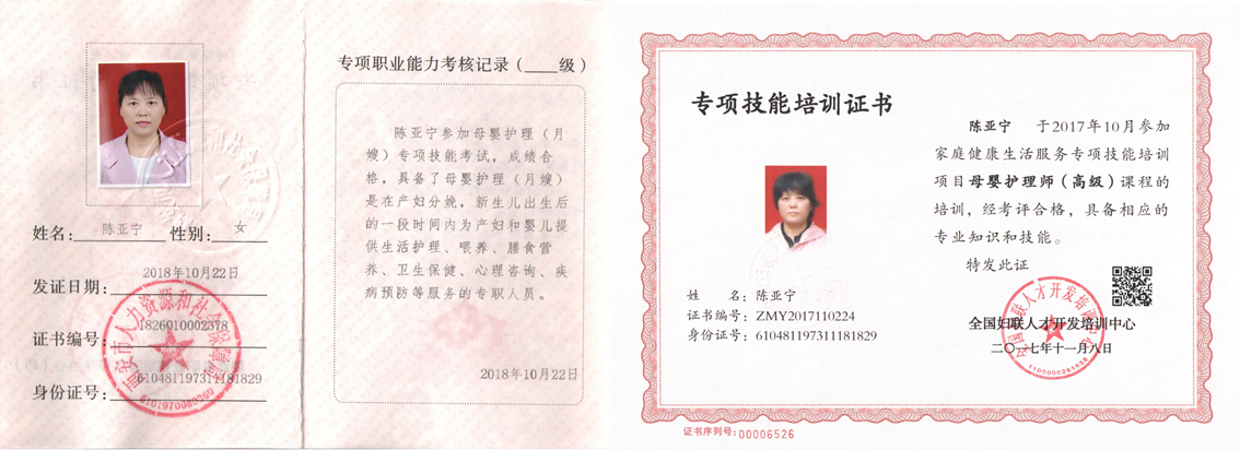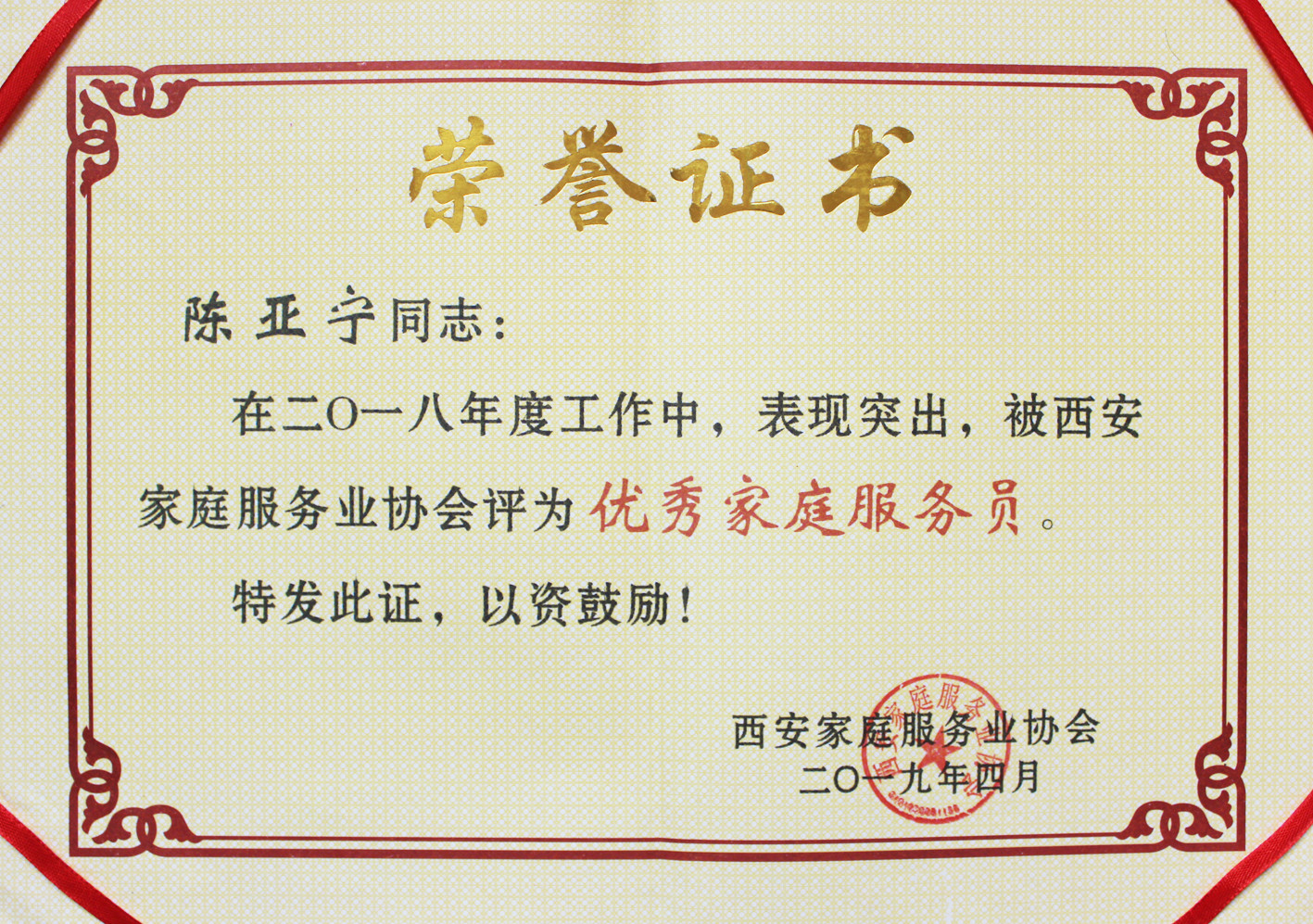 陳亞寧榮獲“2018年度優秀家庭服務員”稱號
