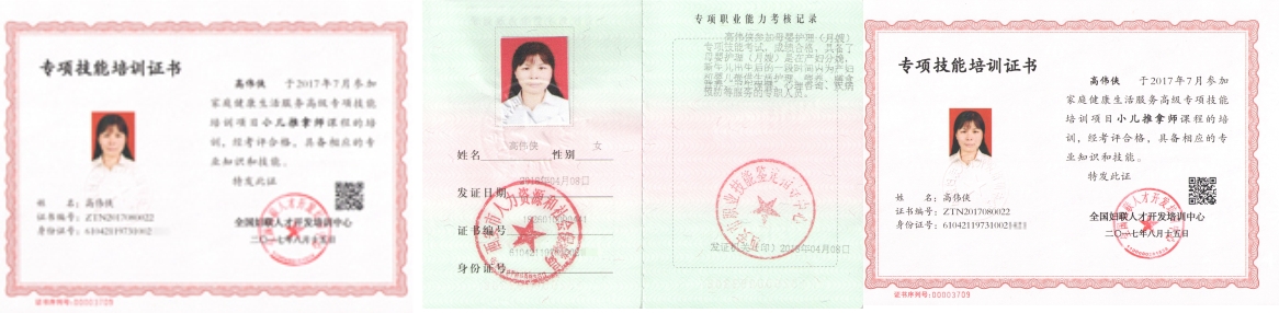 性格開朗,謙虛、自律、勤奮好學、踏實,專業(yè)技能精湛,輔食添加到位,早期教育指導到位。