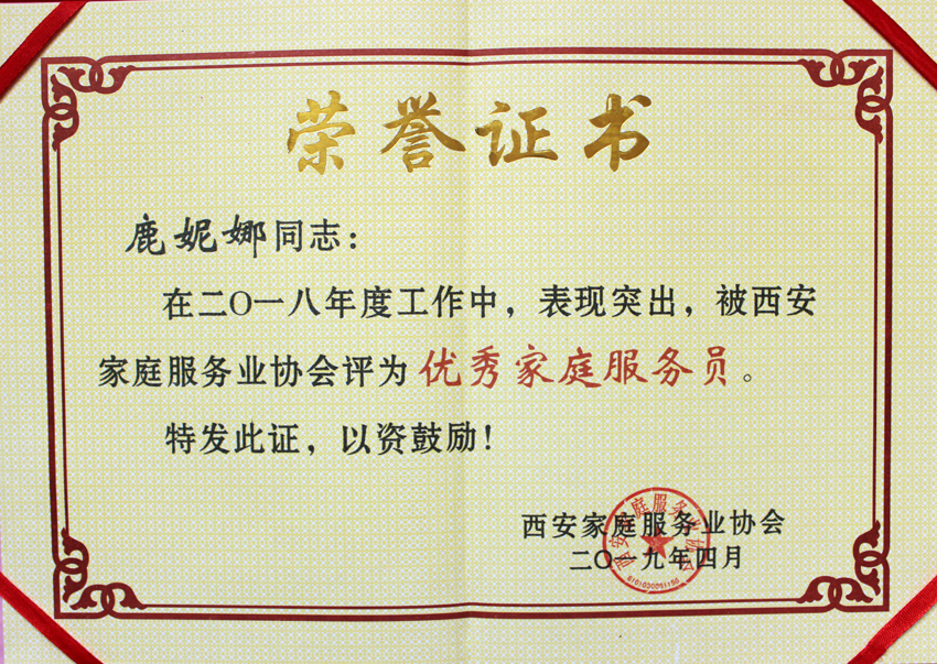 恭喜鹿妮娜榮獲“優秀家庭服務員”稱號