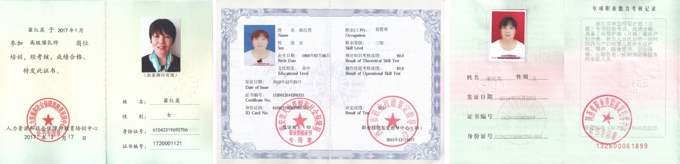 2009-2011年在婦聯家政做育兒嫂,2012年經朋友介紹來到燕子月嫂公司參加培訓,深的培訓老師青睞,同年正式加入工作,入職至今已服務50戶左右,顧客好評率高。