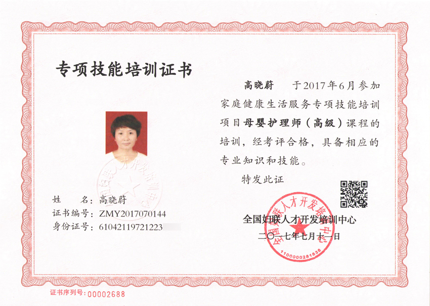 個人簡介:2015年經朋友介紹進入燕子月嫂公司,經過專業培訓考核,獲得相關證書開始從事育嬰工作。我很慶幸自己能夠成為這個行業的佼佼者,經過這幾年的工作,我積累到了豐富的育兒經驗,懂得了和客戶之間如何相處如何溝通,現在工作起來 思路清晰,有條理。曾在同一客戶家服務長達一年之久,服務結束,客戶滿滿的感動,不舍之情讓我記憶猶新,為表感激之情,客戶專門送錦旗到公司,感謝客戶對我的信任,我會更加努力做好這個神圣的工作。
