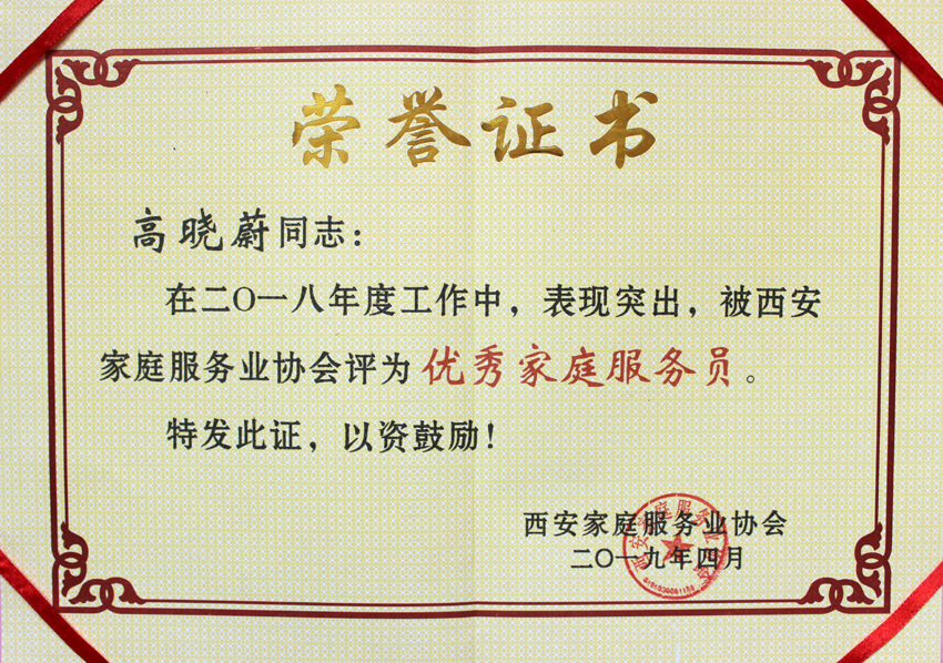 恭喜高曉蔚榮獲“優秀家庭服務員”稱號