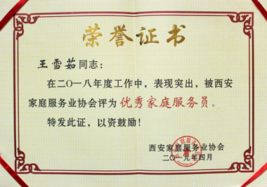王雪茹榮獲家協“優秀家庭服務員”稱號