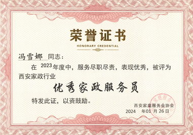西安燕子月嫂馮雪娜評為西安家政行業“優秀家政服務員”