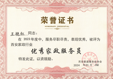 西安燕子月嫂王艷紅評(píng)為西安家政行業(yè)“優(yōu)秀家政服務(wù)員”?