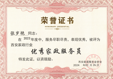 西安燕子育嬰師張歲艷評為西安家政行業“優秀家政服務員”